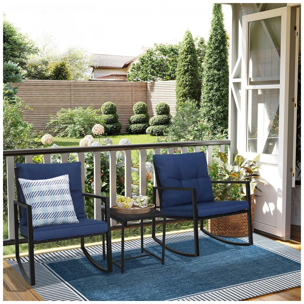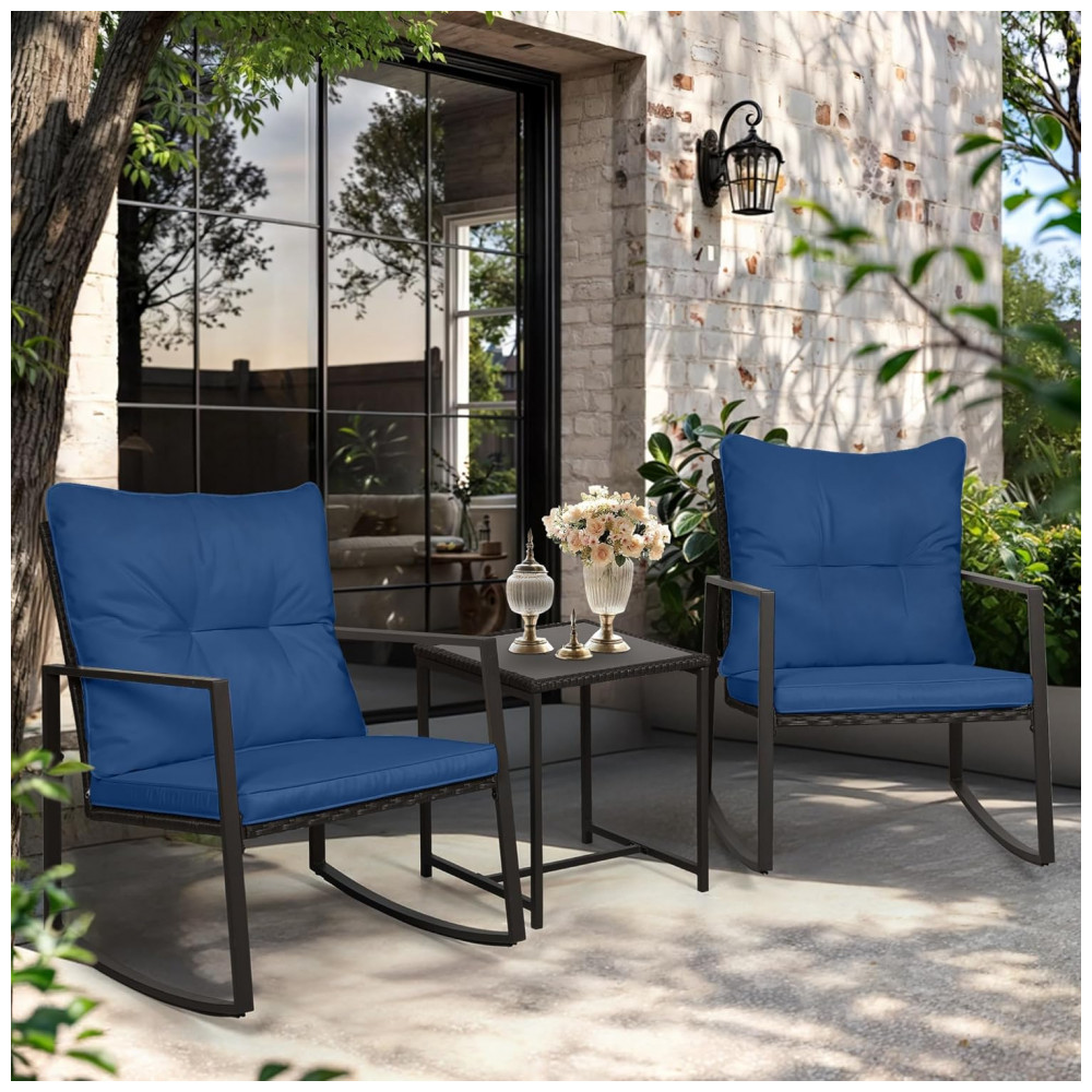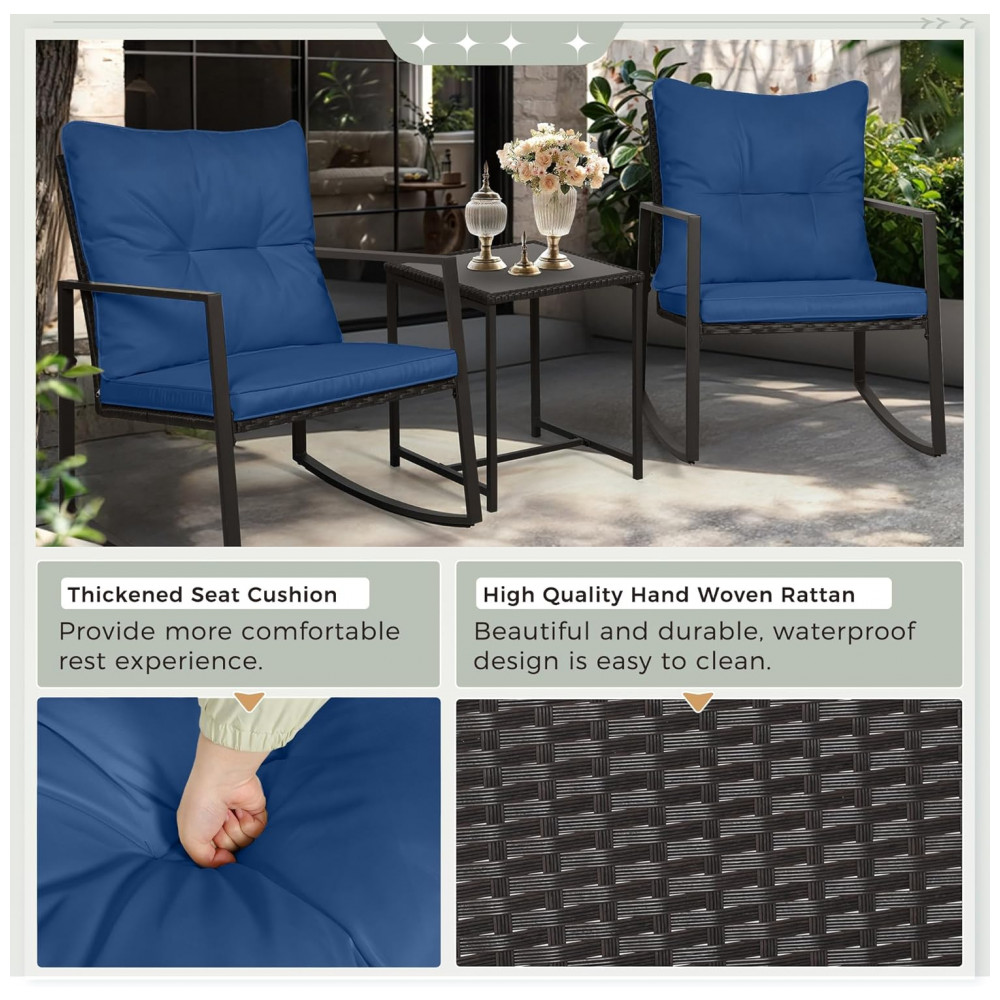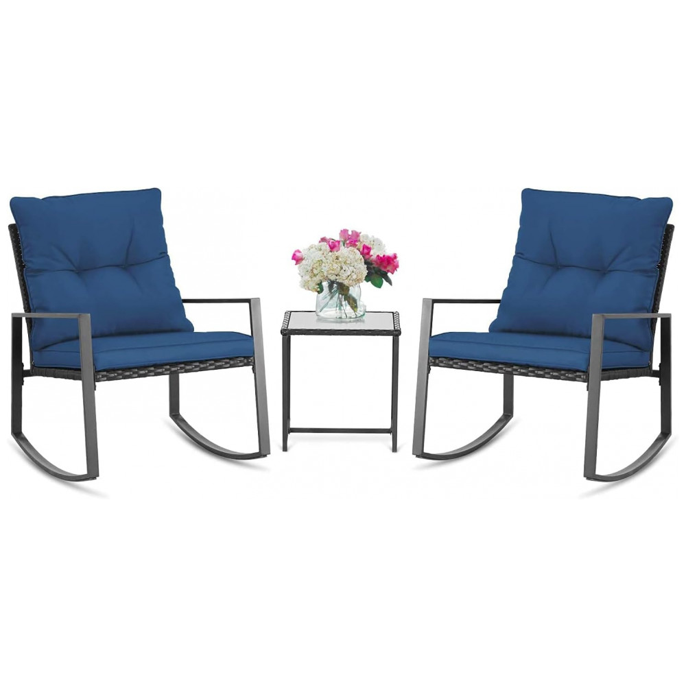 Conjunto de Balanço de Exterior de 3 Peças SUNCROWN em Vime Preto – Cadeiras de Varanda com Mesa de Centro de Vidro para Conversas Azul Escuro