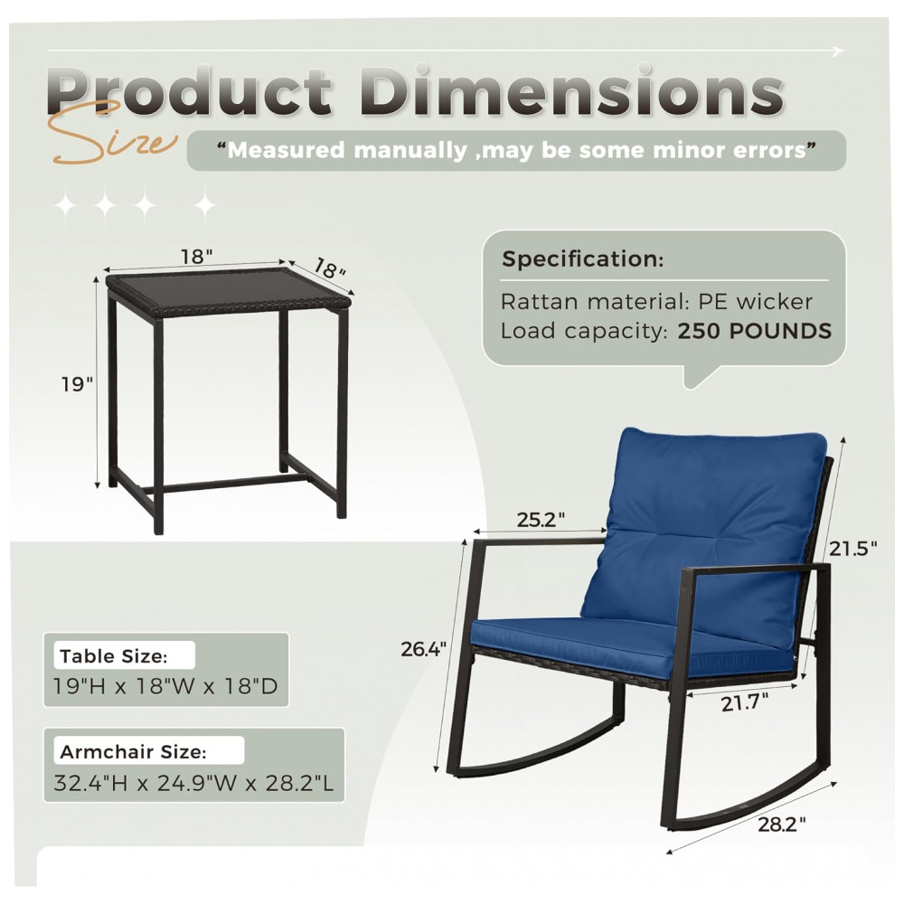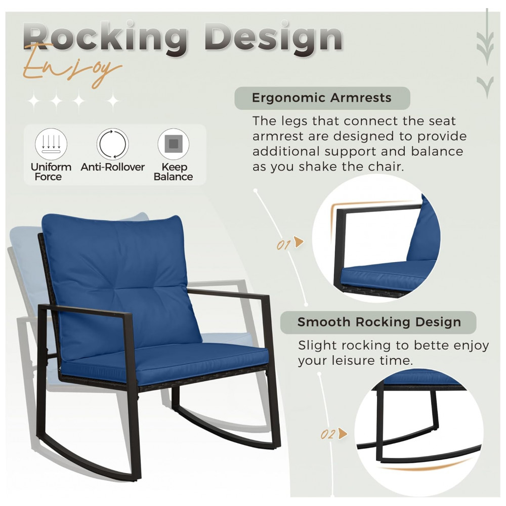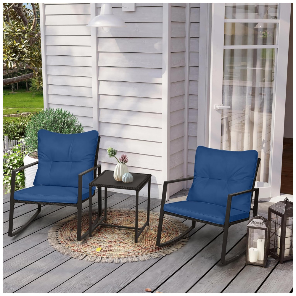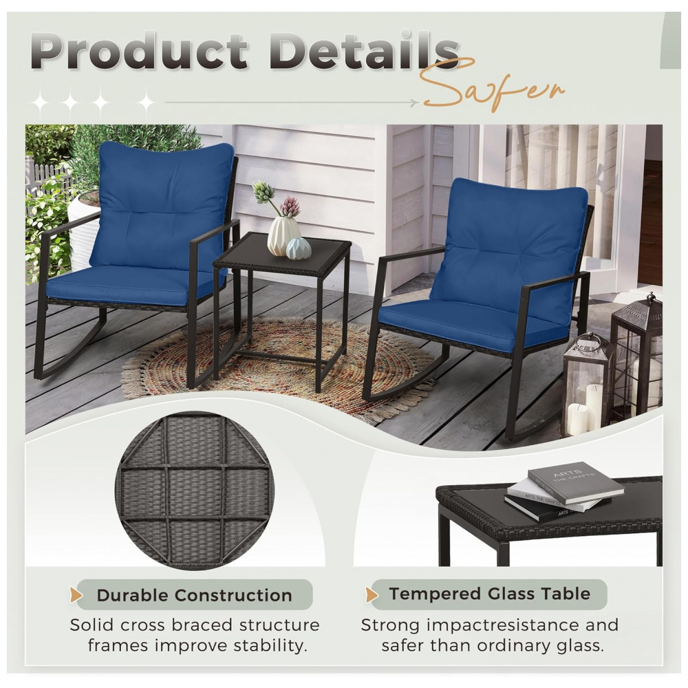 Conjunto de Balanço de Exterior de 3 Peças SUNCROWN em Vime Preto – Cadeiras de Varanda com Mesa de Centro de Vidro para Conversas Azul Escuro
