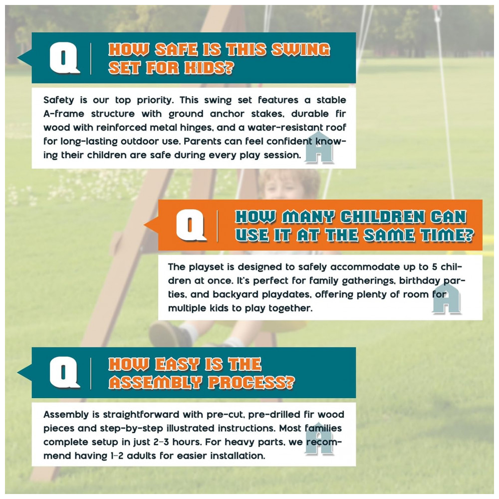 O conjunto de balanço de madeira Albott 6 em 1 oferece uma estrutura robusta em madeira natural com suporte tipo A para garantir estabilidade durante o uso. Possui uma torre com casa para brincar, equipada com um teto tipo tenda colorido que fornece sombra e um espaço de observação para crianças. O escorregador é projetado com formato em onda para proporcionar descidas seguras e suaves. Conta com dois balanços tipo cinto e uma barra trapezoidal, permitindo múltiplas modalidades de balanço simultaneamente. Inclui parede de escalada com apoios manuais para desenvolvimento de habilidades motoras, além de uma escada segura para acesso. O conjunto mede aproximadamente 245 cm de profundidade, 152 cm de largura e 245 cm de altura, ideal para uso em quintais ao ar livre. O produto é feito em madeira durável, adequado para uso externo prolongado.
