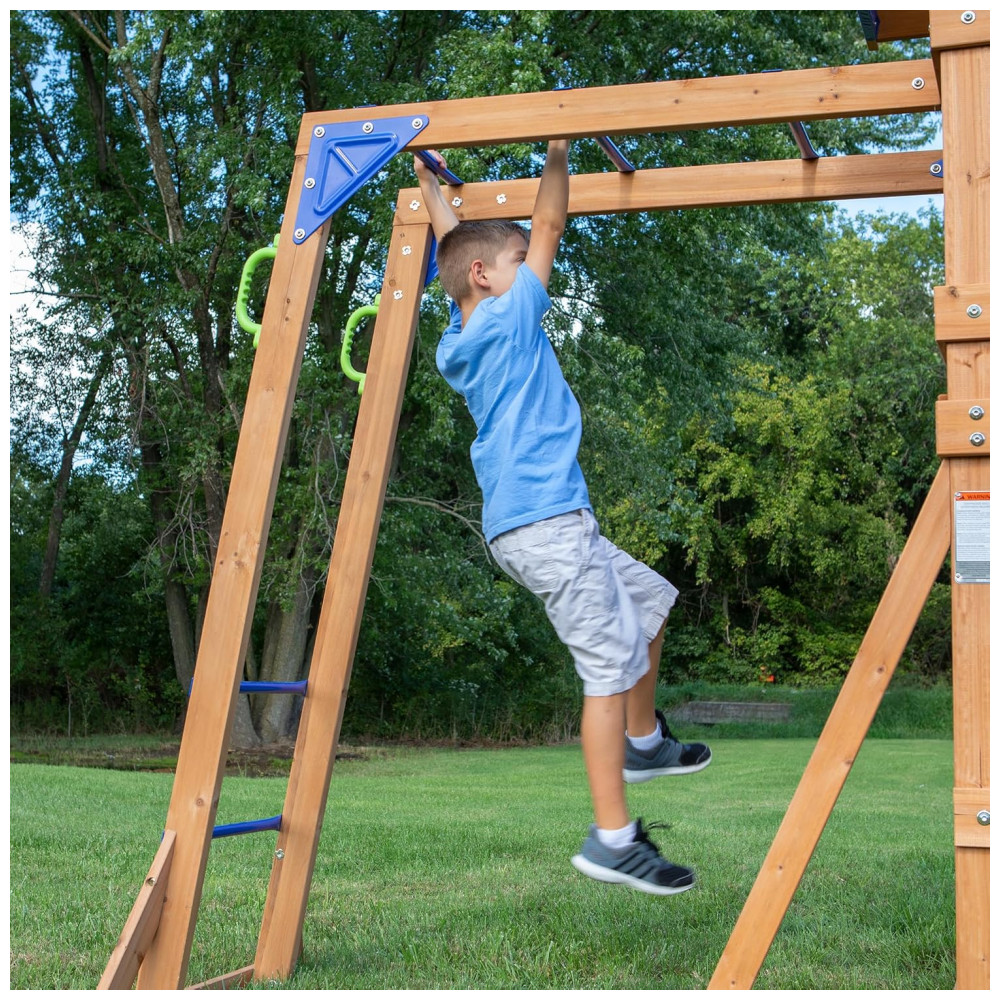 O conjunto de balanço Beach Front da Backyard Discovery é fabricado em madeira de cedro 100% natural, reconhecida pela alta resistência mecânica e durabilidade com resistência inerente à decomposição natural. Possui área elevada para brincadeiras com deck coberto por toldo colorido em lona, equipado com volante de navio e telescópio de brinquedo para interação. Conta com área inferior sombreada de caixa de areia para jogos sensoriais (areia não incluída) e janela em balcão de lanche com banco para refeições ao ar livre. Inclui barras de macaco para atividades de força e escalada, duas gangorras clássicas de cinto e um trapezio para uso simultâneo por múltiplas crianças. O escorregador ondulado mede 2,44 metros proporcionando descidas rápidas e seguras. Escada em parede de escalada com seis apoios para acesso seguro ao deck. Capacidade máxima recomendada de 399 kg para até 2 usuários. Acabamento pré-corado em tom marron claro que ressalta a beleza natural da madeira. Atende as normas ASTM para segurança residencial.Requere montagem com componentes pré-cortados e pré-perfurados, com instruções de montagem interativas via aplicativo BILT®. Produto indicado para crianças de 3 a 10 anos.