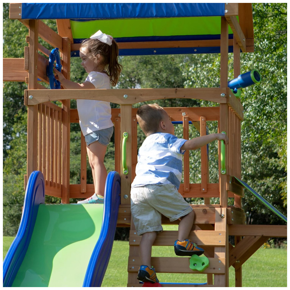 Componentes: Deck elevado com toldo, volante e telescópio, caixa de areia sombreada, janela de balcão de lanche, barras de macaco, 2 gangorras, 1 trapezio, escorregador ondulado de 2,44 m, escada em parede de escalada com 6 apoios
