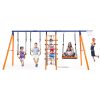 Conjunto de Balanço Infantil 6 em 1 Dolphin Playground T Madeira Natural Multicolorido com Escorregador Onda Parede de Escalada 2 Balanços de Cinto e Caixa de Areia Capacidade 200 kg