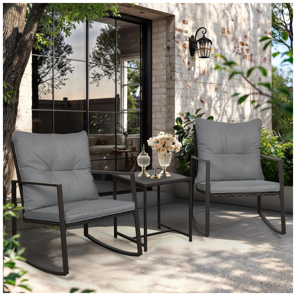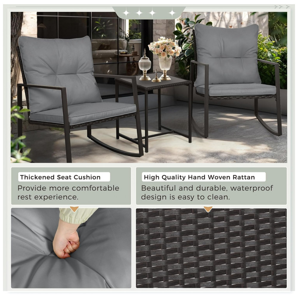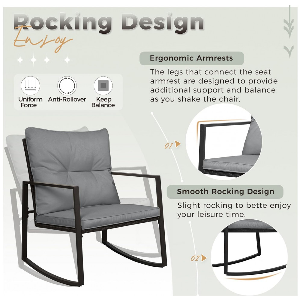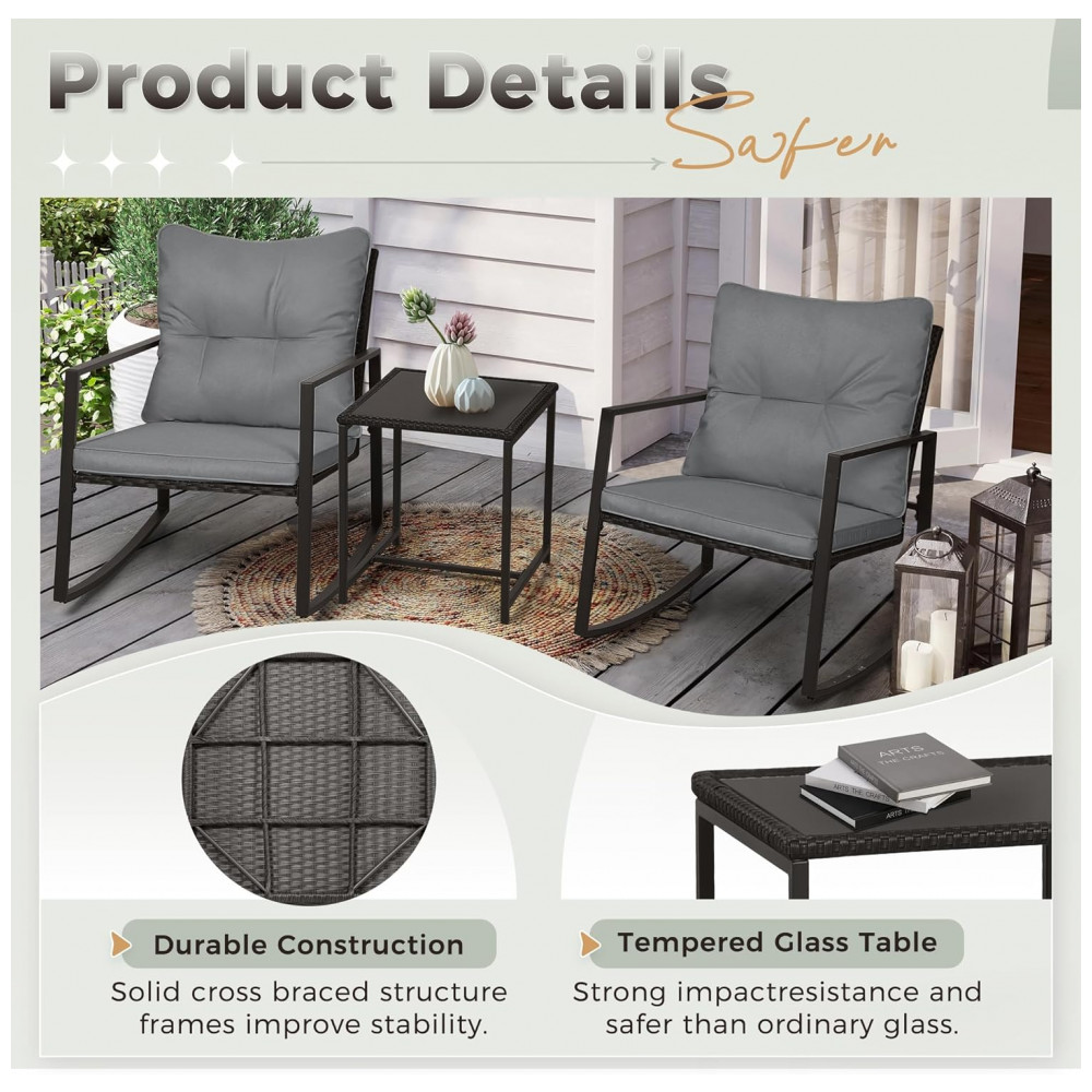 Conjunto de Balanço para Varanda SUNCROWN 3 Peças em Vime Preto com Mesa de Centro de Vidro – Cinza Escuro