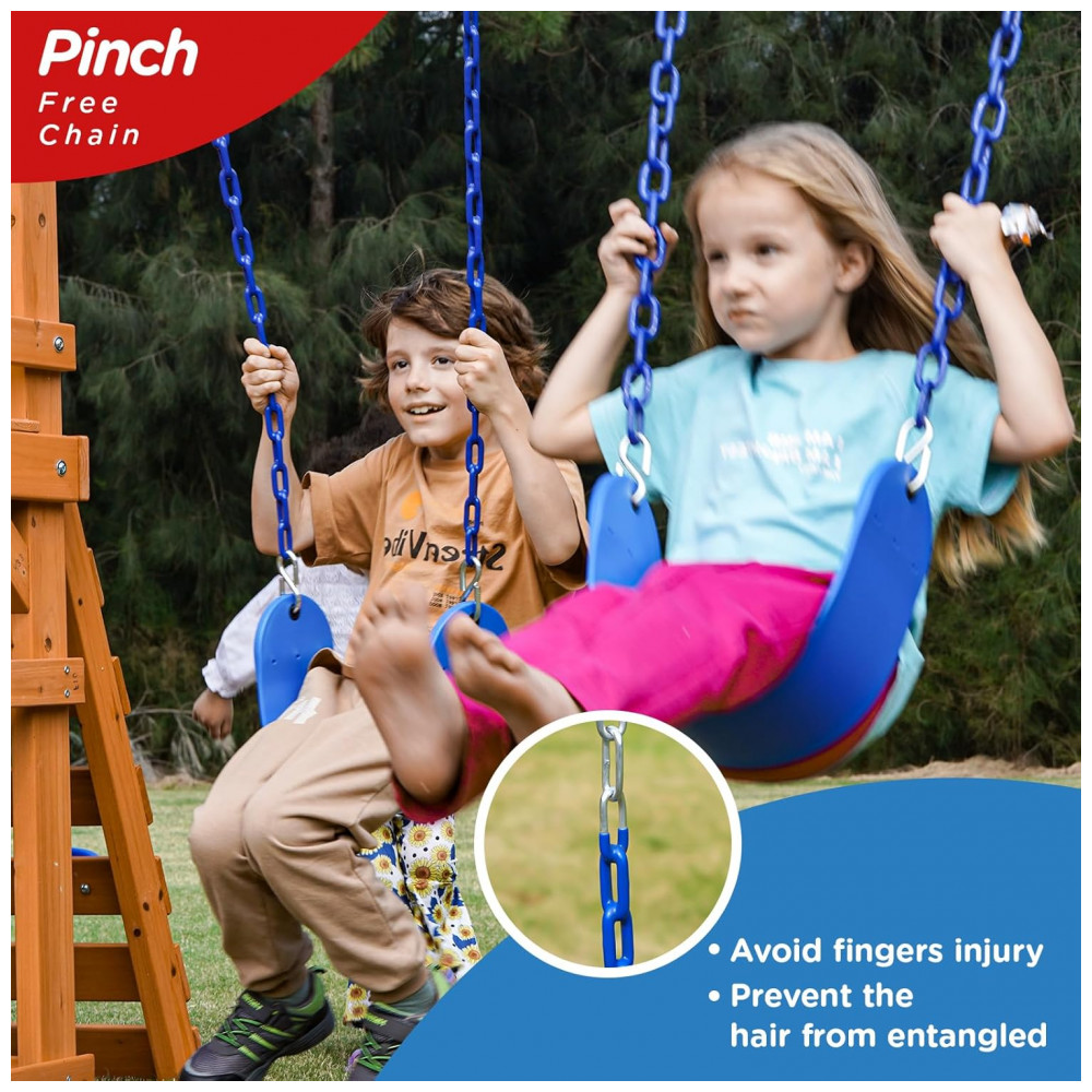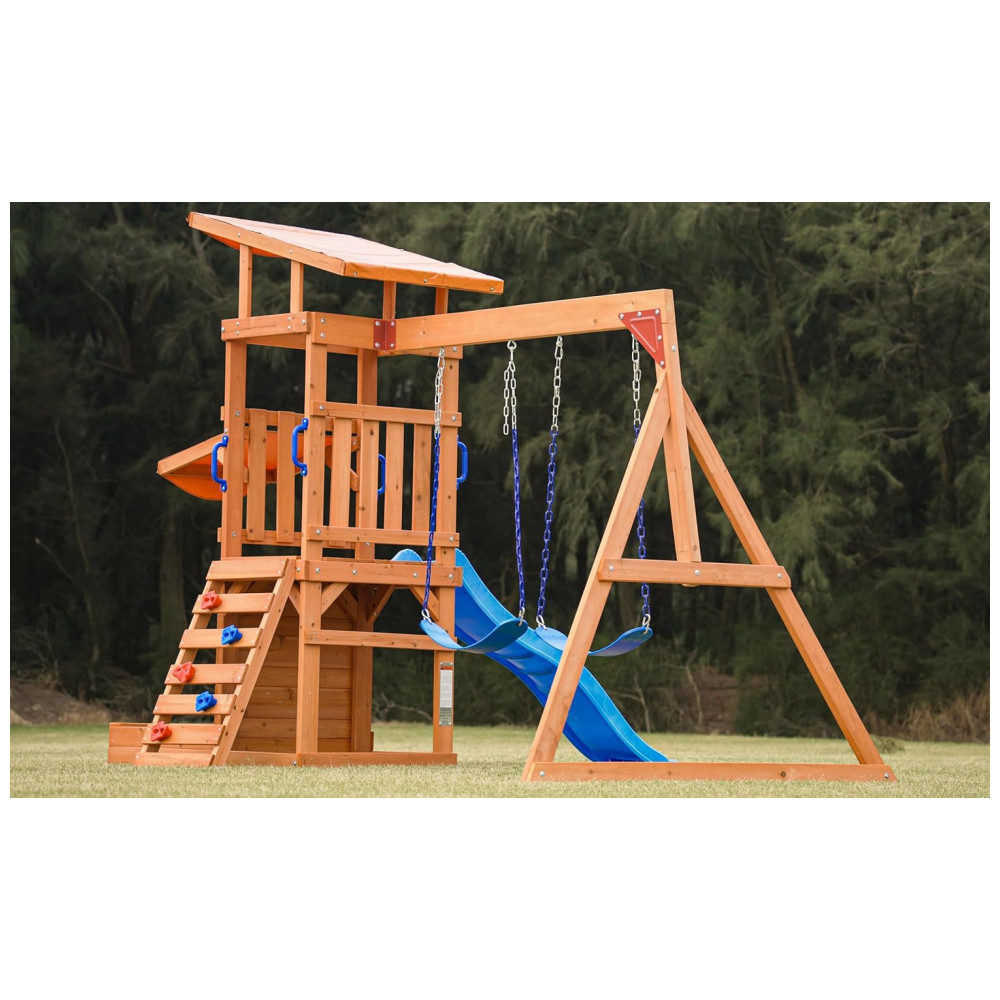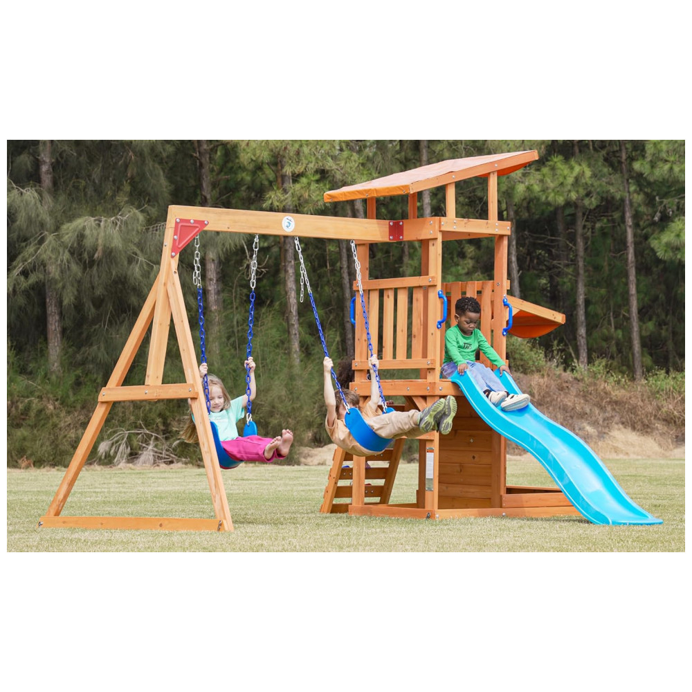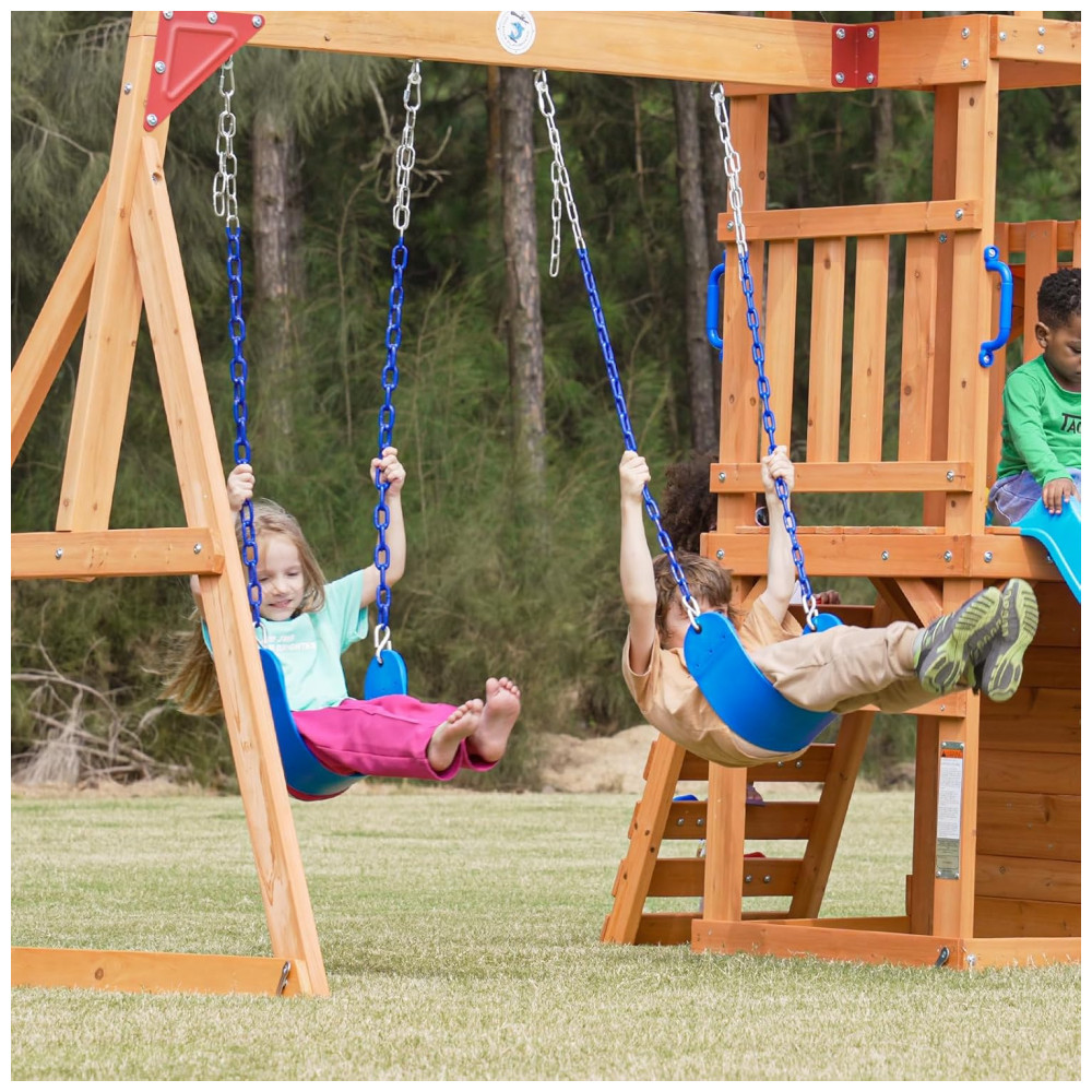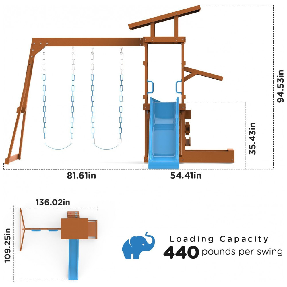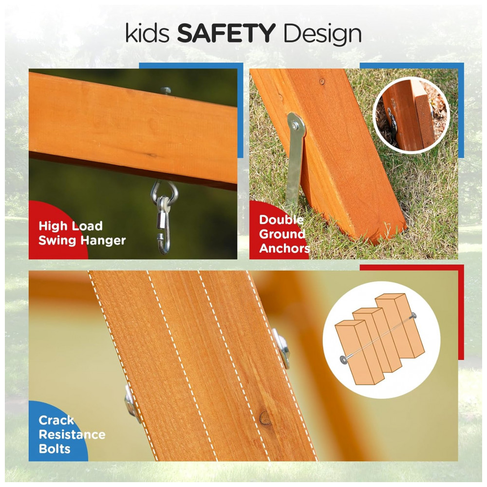 O conjunto Dolphin Playground T é construído em madeira de cedro natural, que oferece propriedades superiores de resistência à água, corrosão e fissuração, adequado para uso em ambientes externos sob diversas condições climáticas. O conjunto inclui escorregador ondulado de 1,83 metros, duas gangorras tradicionais de cinto, uma caixa de areia com forro impermeável e toldo resistente aos raios UV, parede de escalada com seis apoios para acesso ao forte com cobertura tipo toldo, que oferece sombra para área de brincadeiras. As correntes dos balanços são projetadas sem pontos de aprisionamento para evitar lesões nos dedos e emaranhamento de cabelo. As estruturas em A são reforçadas com parafusos anti-fissura para evitar trincas na madeira, proporcionando maior durabilidade. A capacidade de carga do balanço é de 200 kg (440 lbs) e o conjunto acomoda até dois usuários simultaneamente. O projeto inclui embalagens ordenadas conforme etapas de montagem, com 10% de peças sobressalentes e instruções em plano 3D para facilitar a instalação. Indicado para crianças de 3 a 6 anos e montado requer assistência.