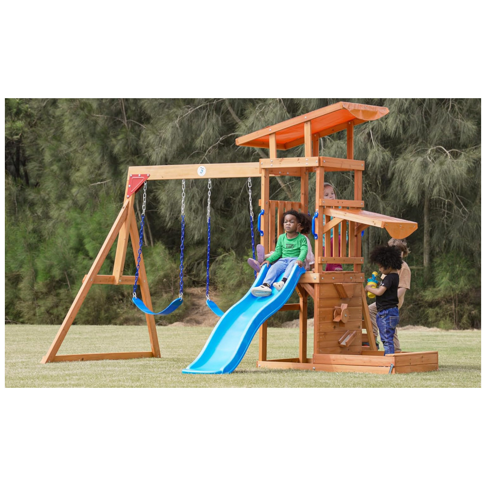Conjunto de Balanços de Madeira Dolphin Playground T Cedro Natural com Escorregador Ondulado 183 m Caixa de Areia Parede de Escalada 2 Balanços de Cinto