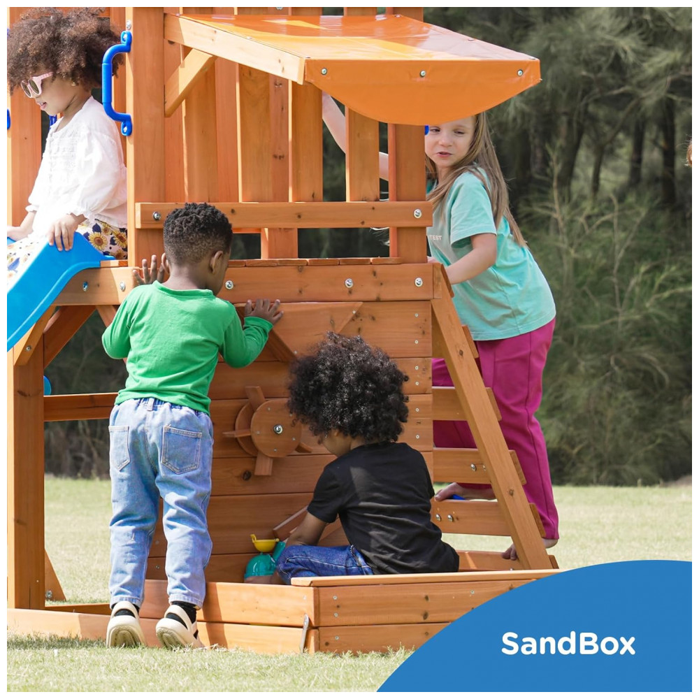 Componentes: 2 balanços de cinto, escorregador ondulado 1,83 m, caixa de areia com forro e toldo, parede de escalada com 6 apoios, forte coberto com toldo