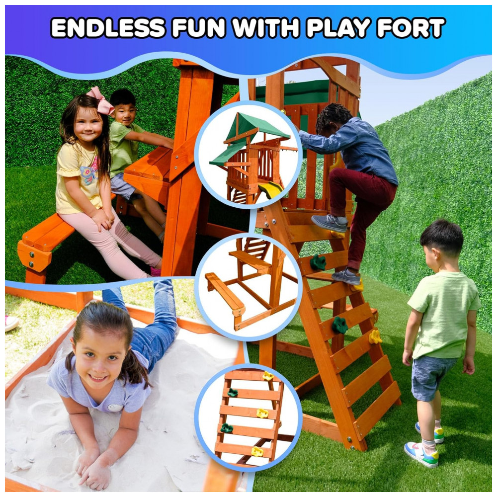 O conjunto de balanços de madeira Sportspower Roseville é confeccionado em madeira de abeto escandinavo da Europa do Norte, reconhecido por sua densidade e resistência superiores. Inclui 6 estações de jogo: escorregador plástico de 1,83 m com zona segura de aterrissagem, 2 balanços com assentos antiderrapantes, trapezista, playfort com toldo de tecido e entrada para escalada, além de caixa de areia e banco com mesa. O design robusto utiliza vigas em estrutura A para máxima estabilidade, sendo recomendado para até 8 crianças com peso total máximo de 363 kg.