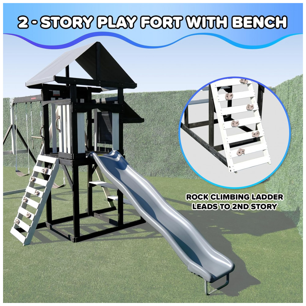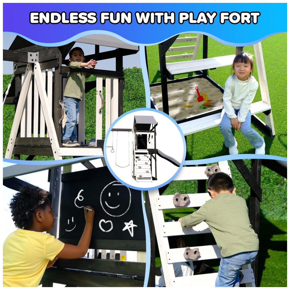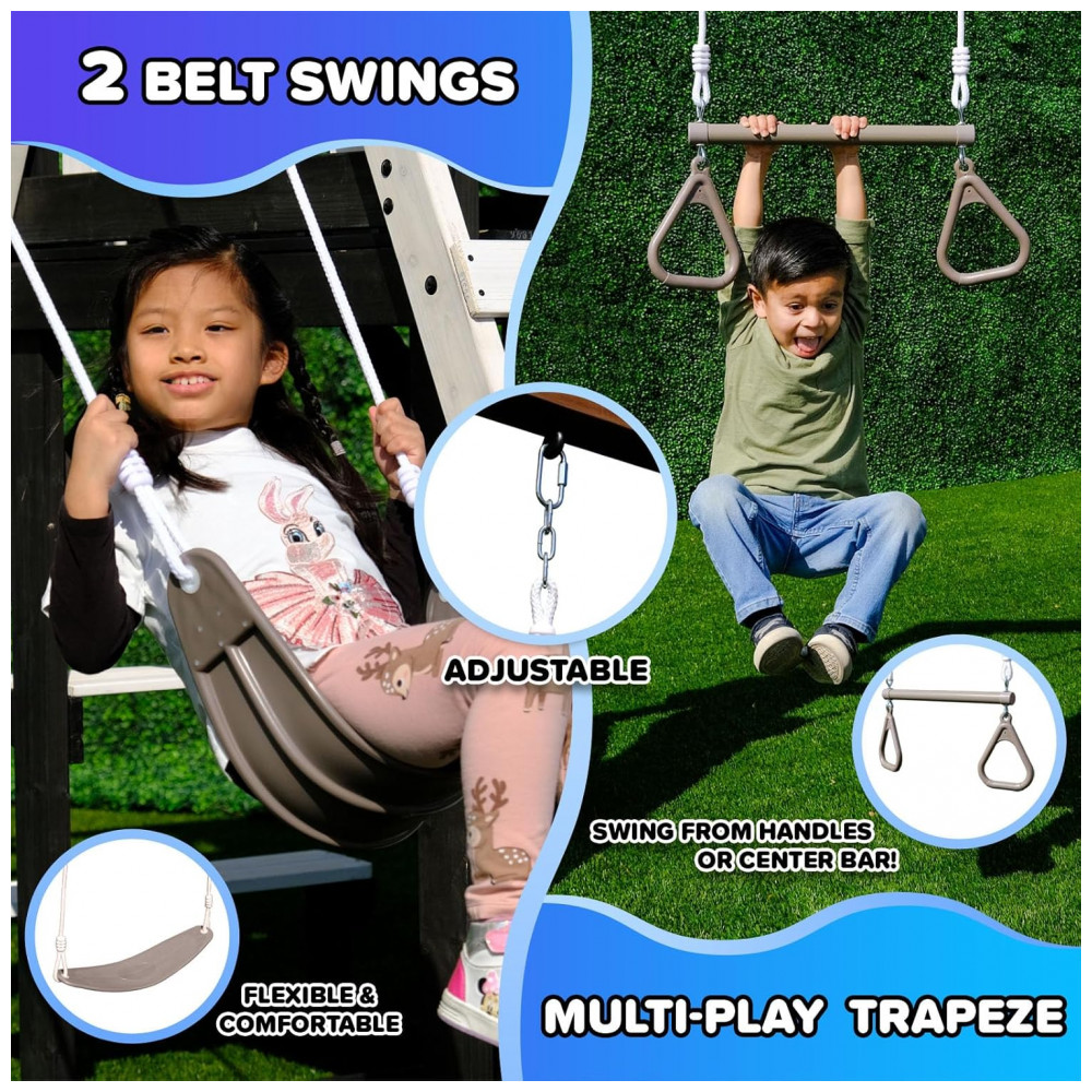 O conjunto de balanços de madeira Sportspower Roswell é fabricado com madeira densa e de alta qualidade, proporcionando robustez e durabilidade superior para uso externo. Possui uma estrutura reforçada com vigas em formato de “A” garantindo maior estabilidade e segurança para as crianças. Inclui 8 estações de recreação: escorregador de 2,44 m, 2 balanços, um trapezista, um playfort com toldo de tecido, quadro-negro, entrada com parede de escalada, caixa de areia e banco com mesa, oferecendo um playground completo para até 8 crianças com peso máximo total de 363 kg.