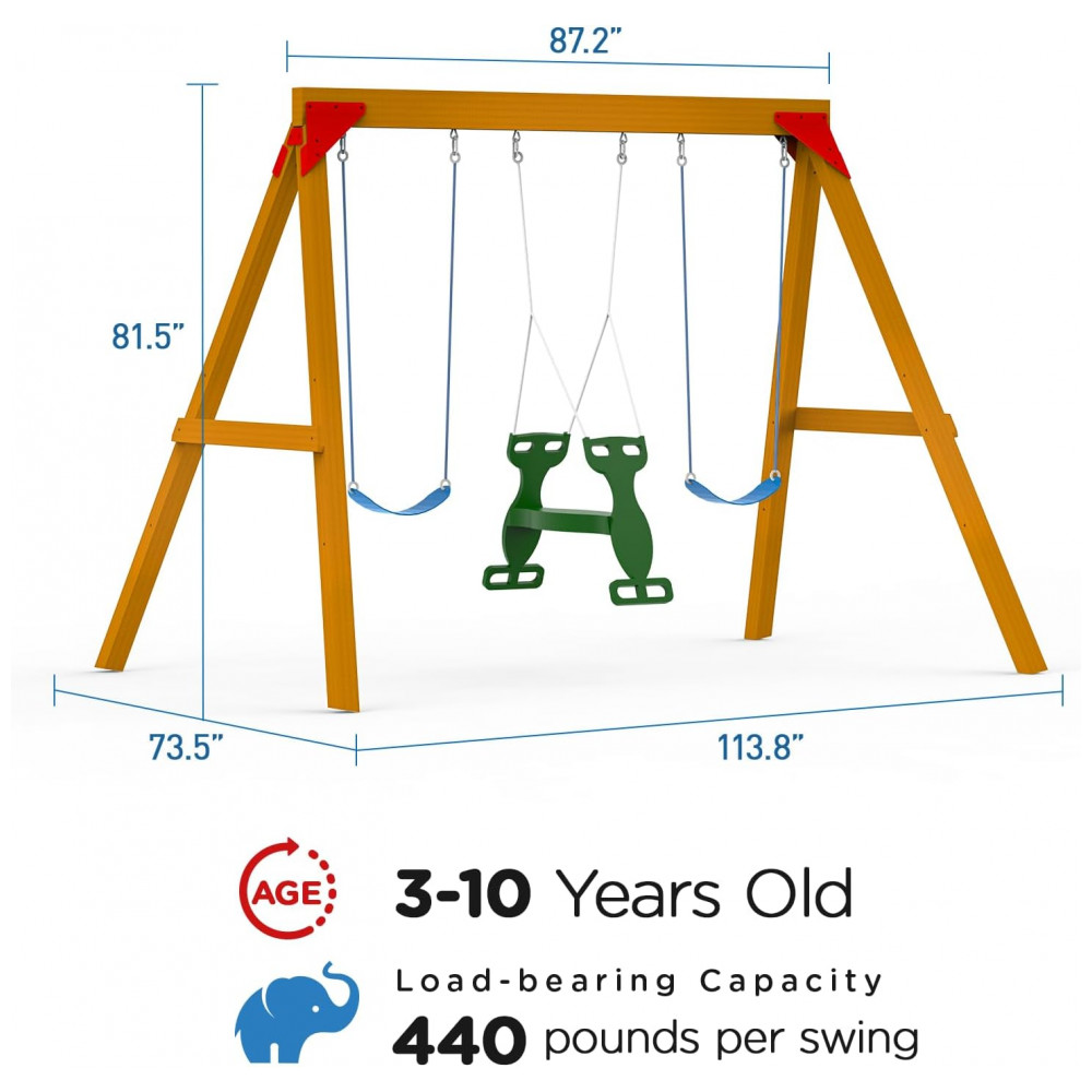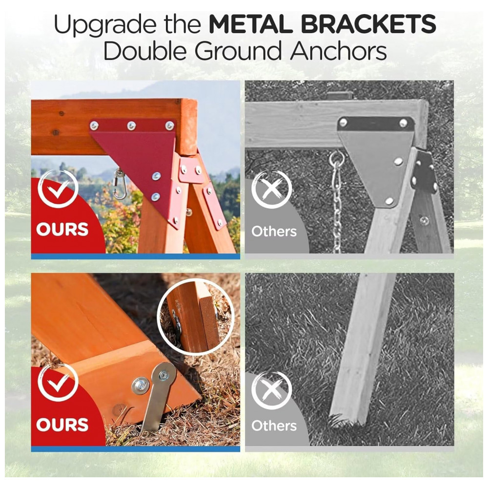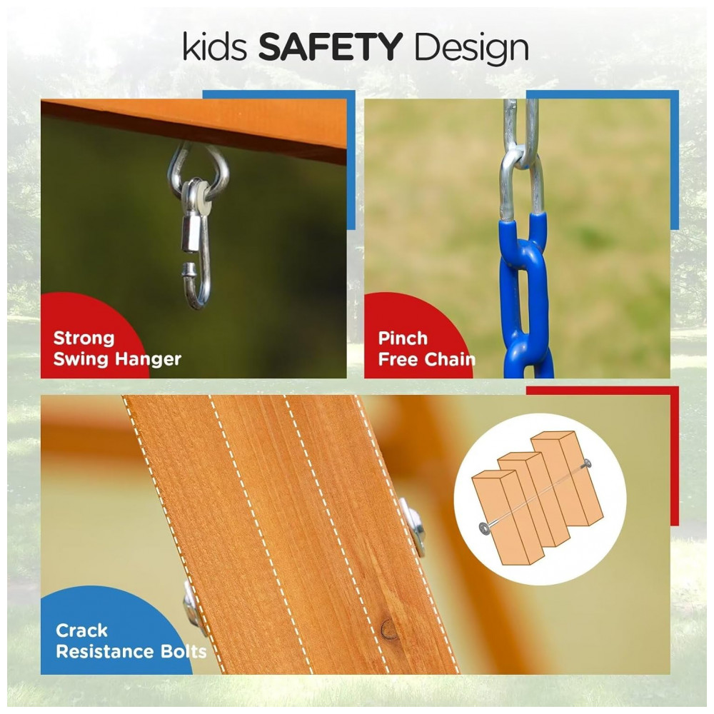 Detalhes de segurança incluem correntes anti-pinchamento que previnem ferimentos nas mãos e evitam emaranhamento de cabelos, além de suportes para balanços com capacidade máxima de carga de 200 kg (440 libras). Os parafusos resistentes à trinca nos pés em formato de “A” evitam a quebra da madeira, reforçando a durabilidade da estrutura. O conjunto já inclui 2 balanços clássicos de cinto e 1 balanço deslizante, com ancoragens duplas para cada poste, garantindo fixação firme ao solo.
