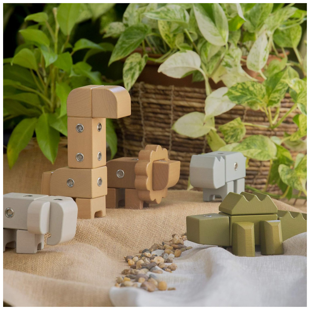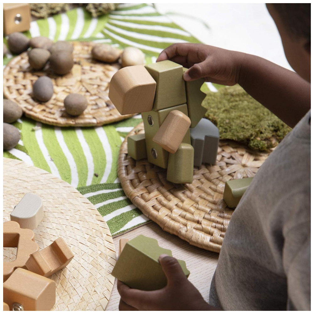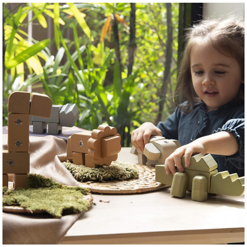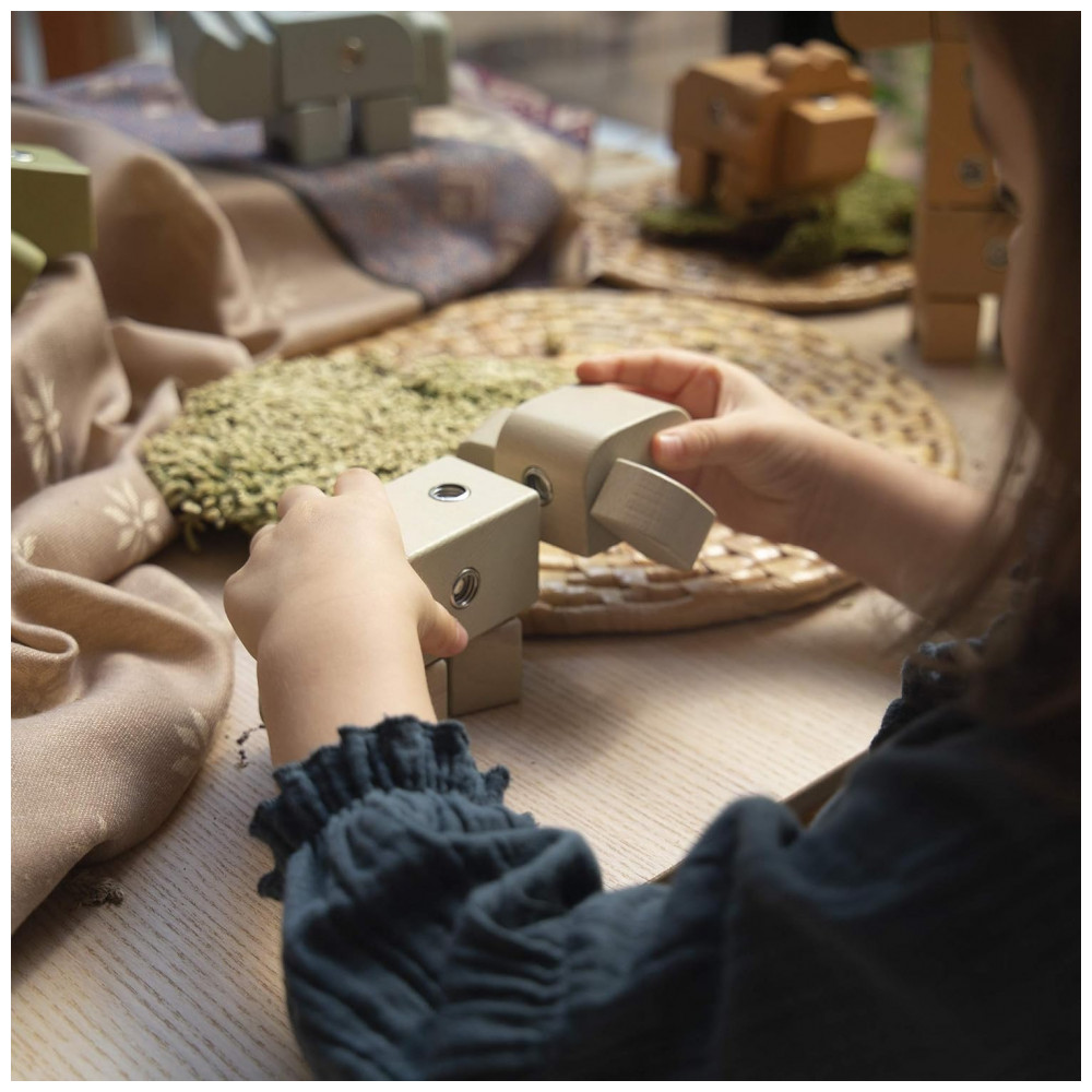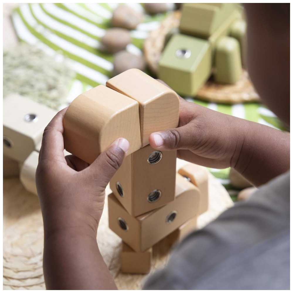 Conjunto infantil de blocos de montagem em madeira com sistema de encaixe metálico tipo “snap”, desenvolvido para criar animais e criaturas imaginárias em atividades de construção livre. As peças são blocos robustos em madeira de faia, levemente pintados em paleta natural com acabamento fosco, oferecendo textura tátil agradável e visual suave para o ambiente infantil.