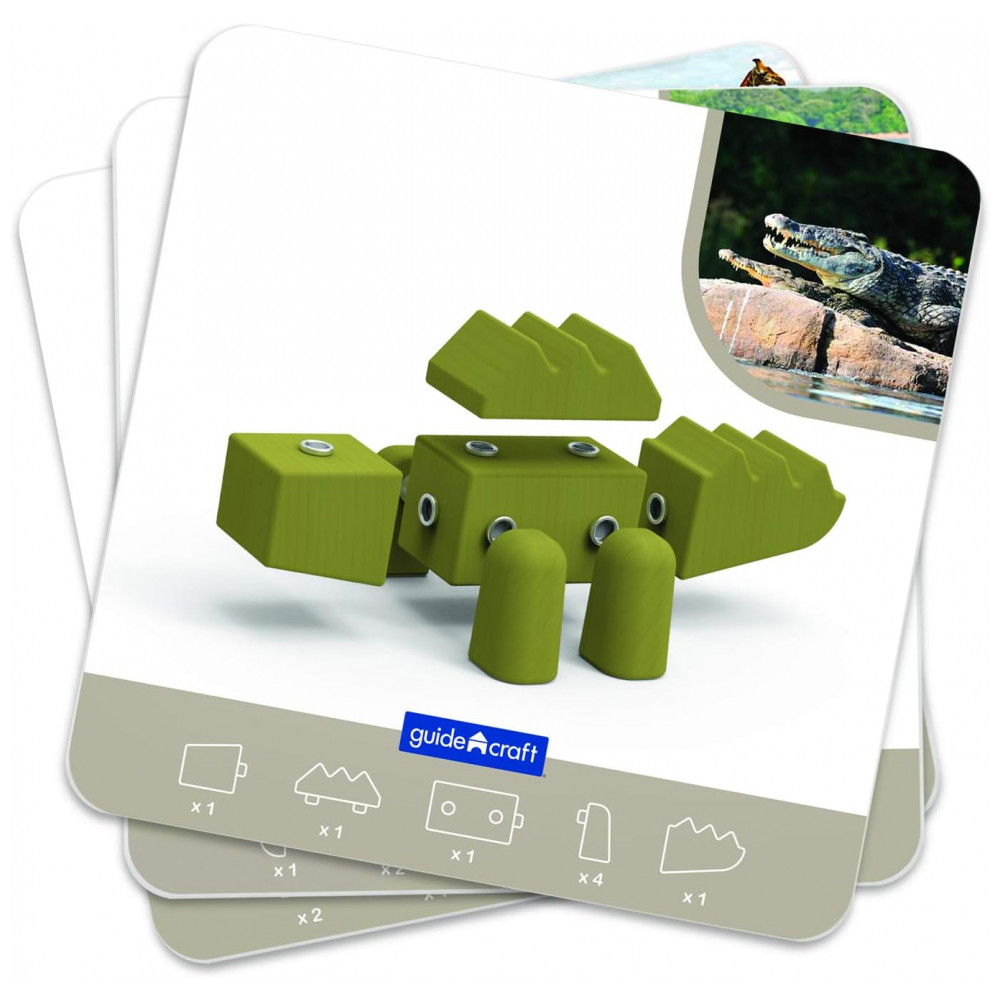 Os blocos se conectam por meio de ferragens metálicas que encaixam com firmeza, permitindo montar e desmontar repetidamente sem uso de ferramentas. As combinações podem seguir os cartões de montagem incluídos, que sugerem animais específicos, ou ser criadas livremente pelas crianças, estimulando narrativas, faz de conta e exploração de formas.