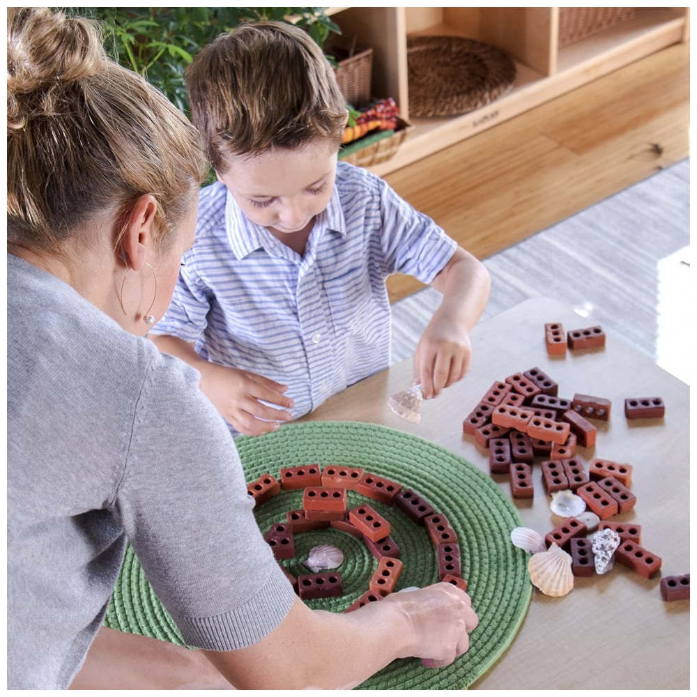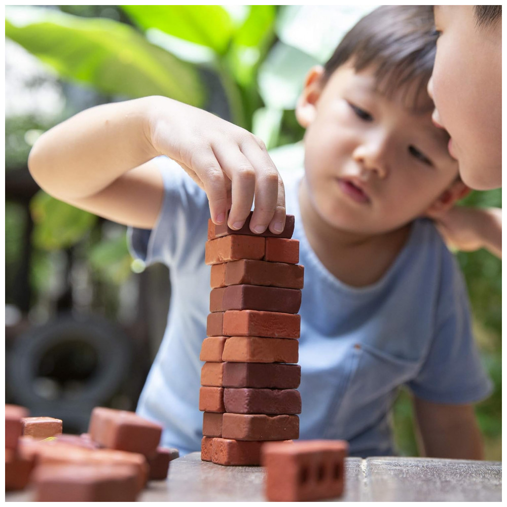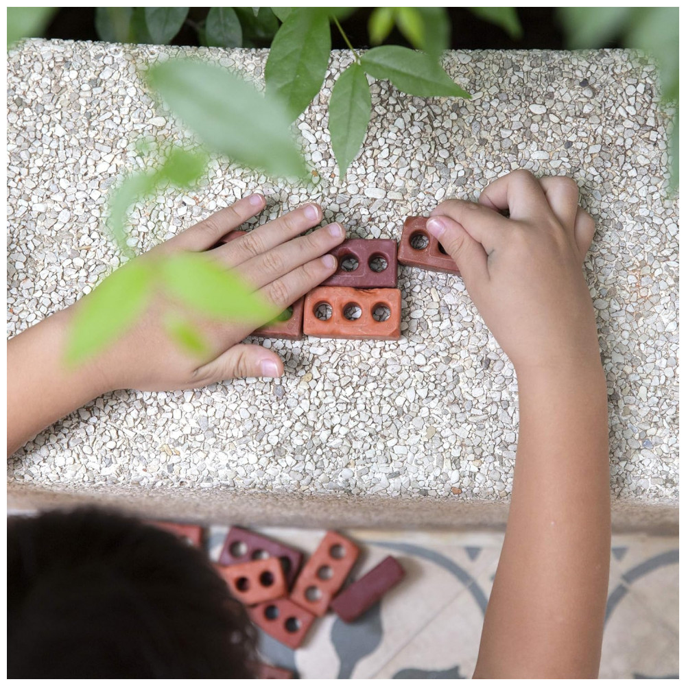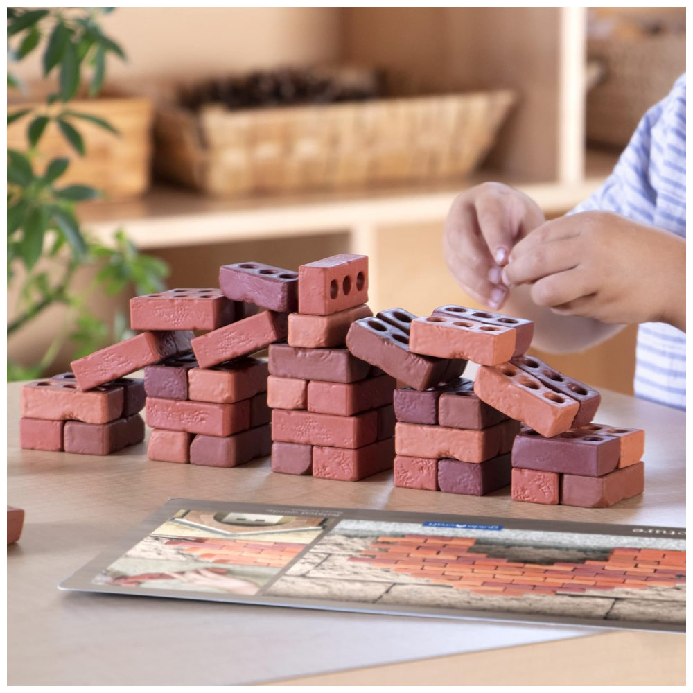 O kit inclui 60 tijolinhos do mesmo formato, em tons de vermelho, pensados para que as crianças pratiquem empilhamento, criação de muros, fachadas e maquetes, além de apoiar atividades de stop motion e construção de cenários. As 10 cartas de conceito dupla face fornecem propostas de estruturas e desafios que trabalham escala, simetria, equilíbrio, raciocínio espacial e noções iniciais de engenharia em contextos domésticos e escolares.