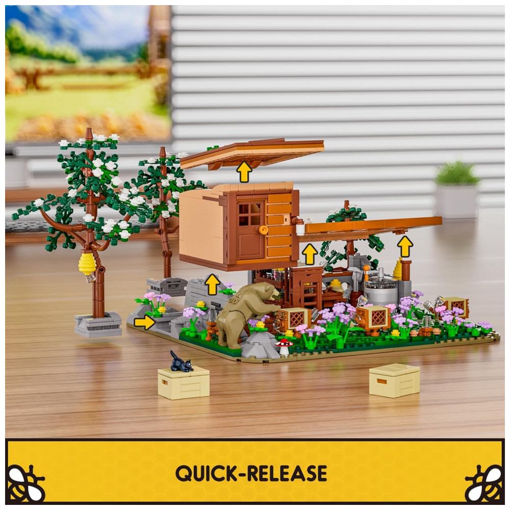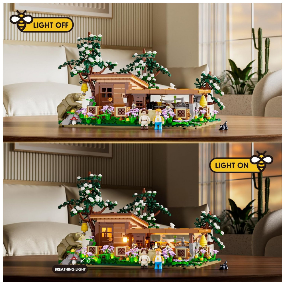 Composto por 1274 peças de plástico ABS intertravado, o kit também inclui modelos de animais como 11 abelhas, gato, urso, pássaro e vaga-lumes com efeito de luz respiratória, criando um cenário dinâmico e realista de fazenda apícola.