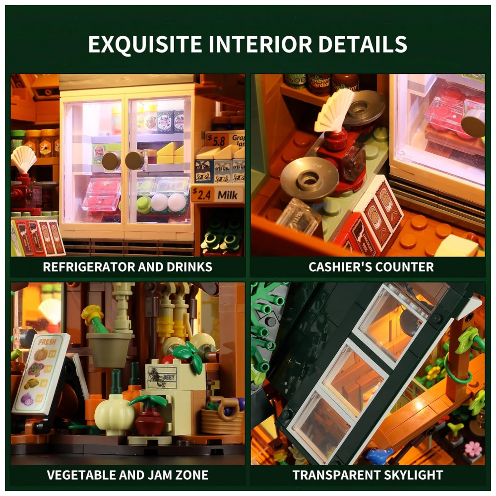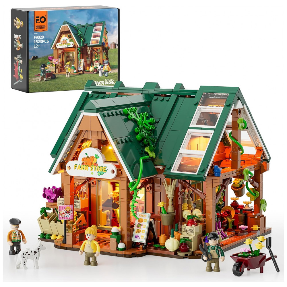 Conjunto de Blocos de Montar FUNWHOLE Loja Fazenda LED 1523 Peças Portas Abertas e Teto Removível Interativo