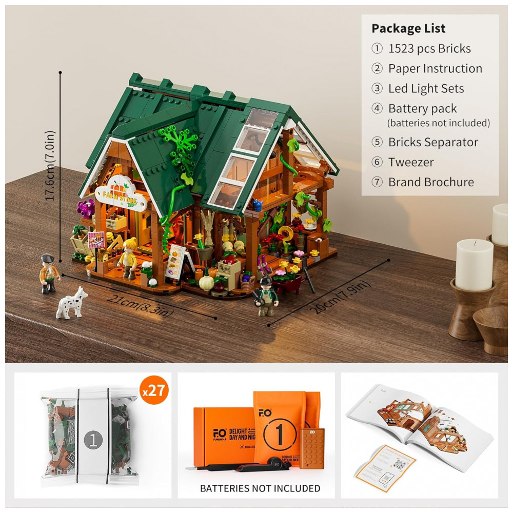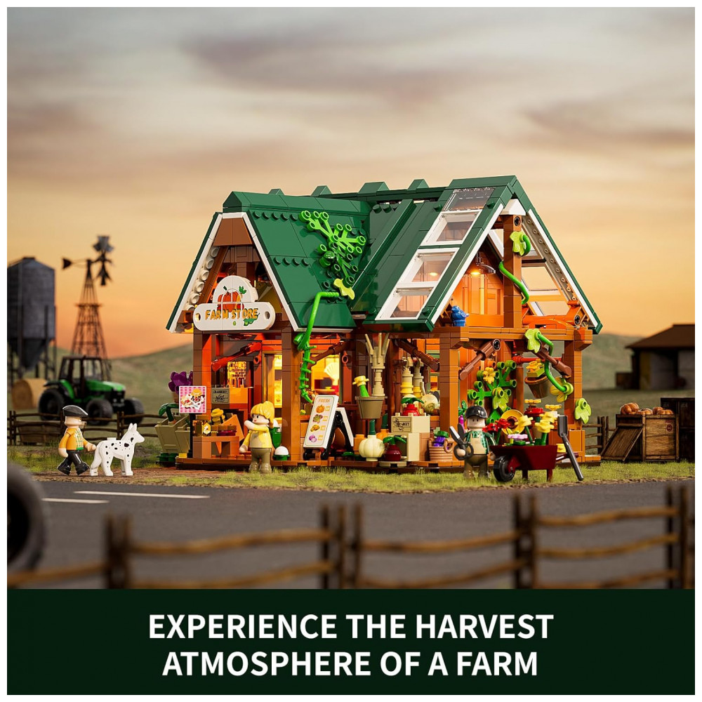 Fabricado em plástico ABS intertravado, o kit de 1523 peças suporta montagem manual avançada, ideal para exposição em vitrines ou combinação com outros conjuntos da coleção Farm Building. Acompanha manual em papel e kits LED.
