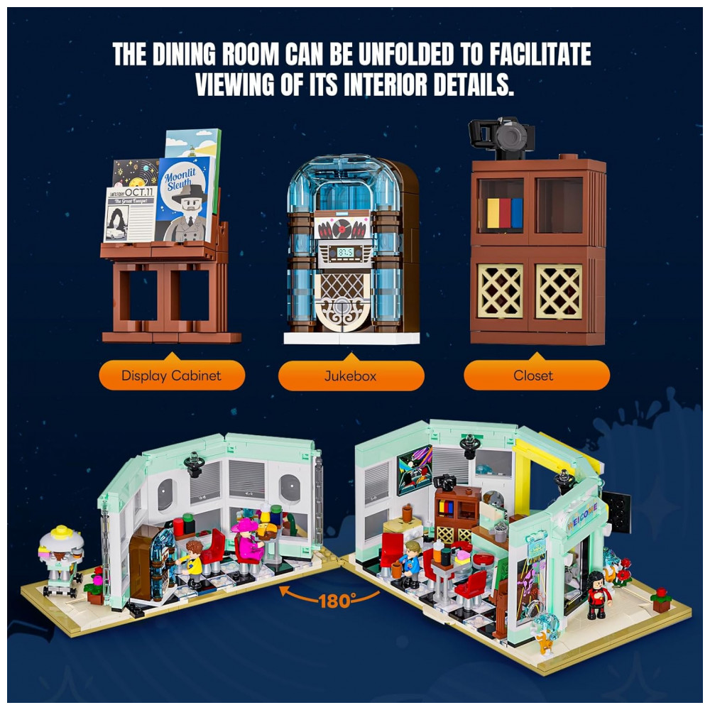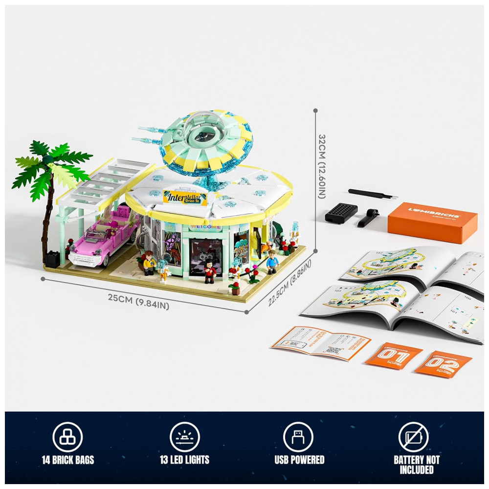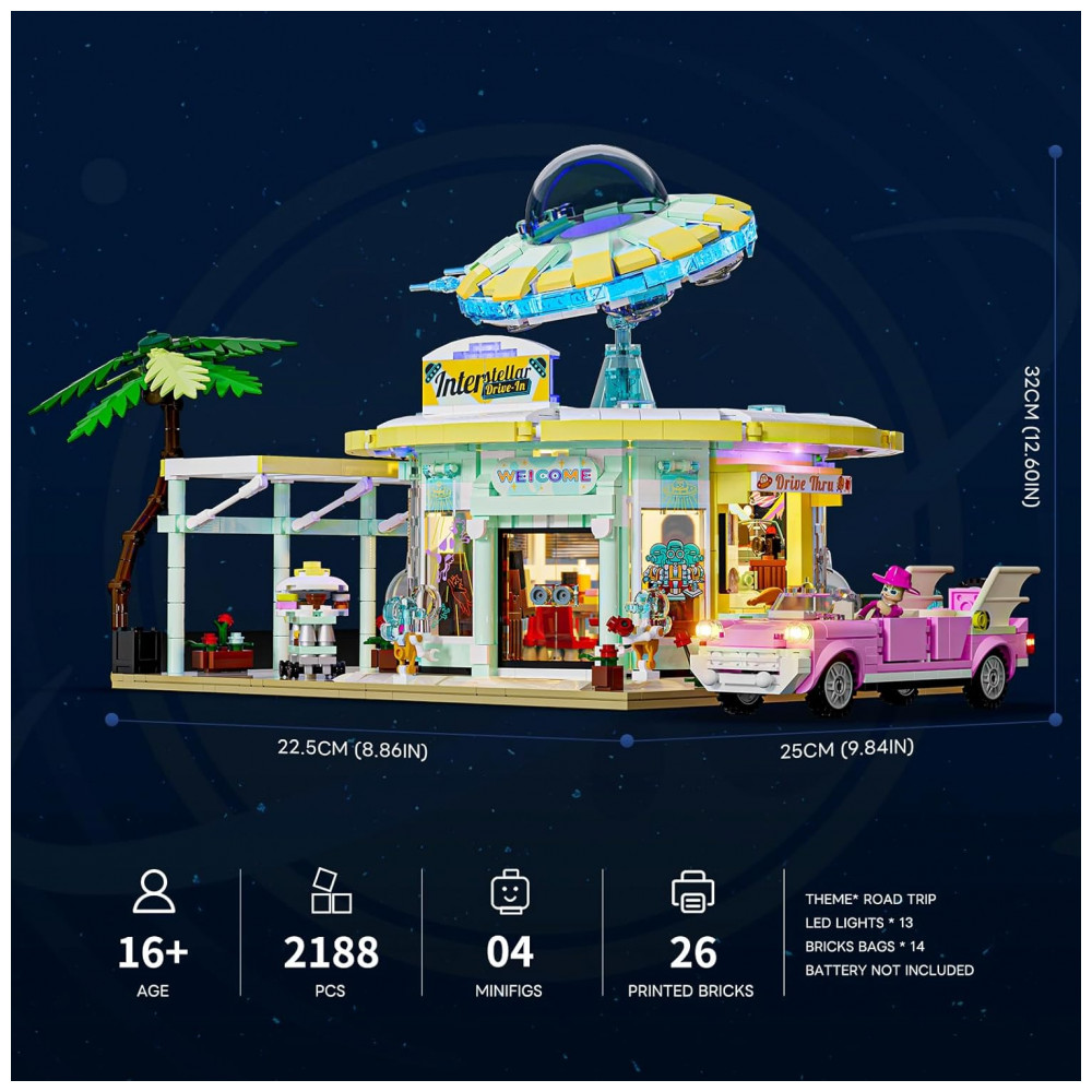 Conjunto de blocos de montar modular com 2188 peças que reproduz um restaurante drive-in em formato de disco voador, combinando elementos retrô e futuristas em um cenário urbano de temática espacial. A estrutura circular tipo diner é encimada por um UFO com letreiro iluminado, criando um visual tecnológico indicado para exposição em coleções adultas.