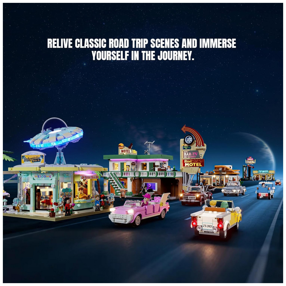 O sistema de iluminação integrado utiliza 14 pontos de luz LED distribuídos em UFO, letreiros e áreas do restaurante, com predominância de tonalidade azul fria para reforçar a estética sci-fi e retrô-futurista. O modelo é recomendado para adultos e entusiastas de cenários urbanos e viagens, funcionando como peça de exposição e projeto detalhado de montagem.