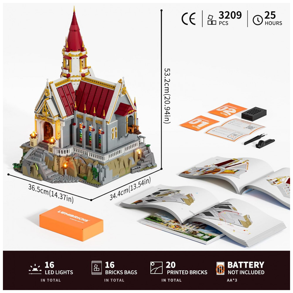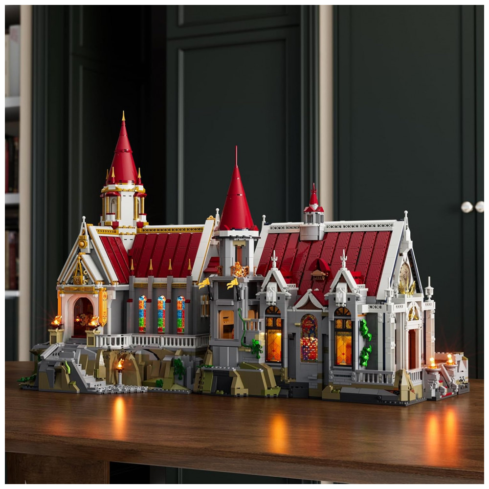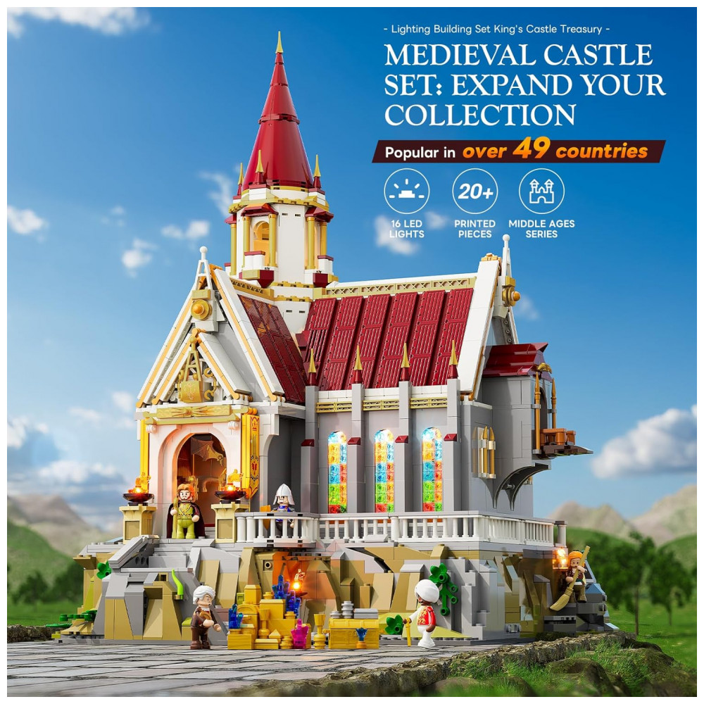 Conjunto de blocos de montar para adultos e adolescentes com 3209 peças que reproduz a tesouraria de um castelo medieval, com volumetria em formato em L, torres, vitrais coloridos, contrafortes e detalhes em pedra e dourado. A construção combina elementos funcionais e decorativos típicos da arquitetura medieval, como arcos ogivais, abóbadas e janelas com vitrais em múltiplas cores.