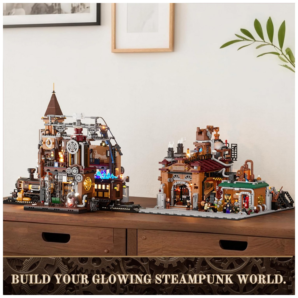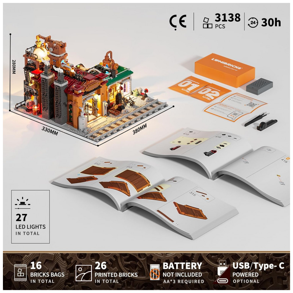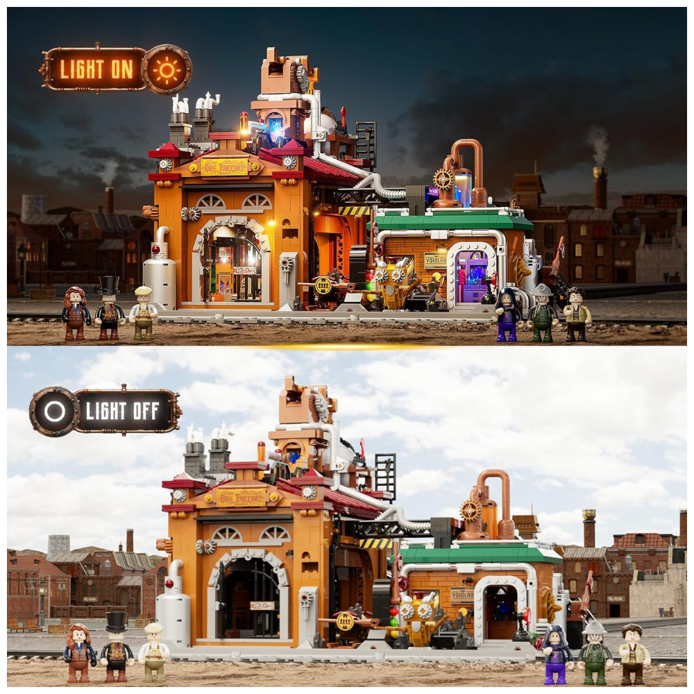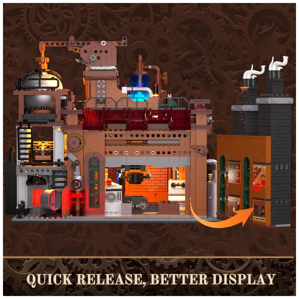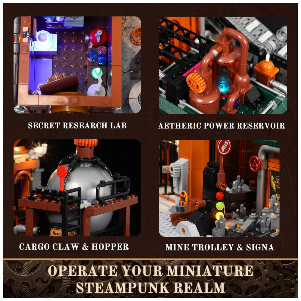 O modelo integra sistema de iluminação com múltiplos pontos de LED e tiras luminosas, com sinalização em vermelho, amarelo e verde, cristais iluminados e luzes de efeito intermitente que simulam ritmo operacional da fábrica. O conjunto faz parte da linha steampunk da marca e foi projetado para uso em dioramas industriais iluminados.