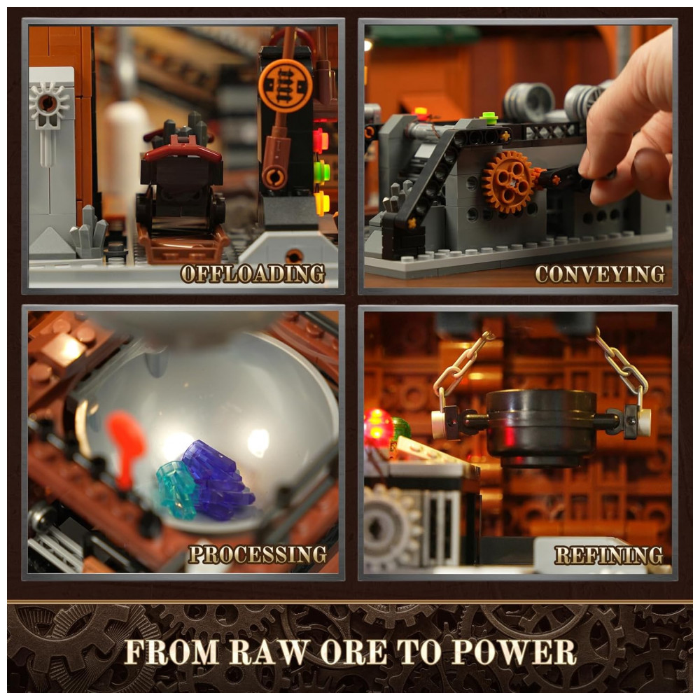 A edificação oferece acessos internos por painéis removíveis, portões funcionais e cobertura destacável em seções, permitindo visualizar o fluxo de entrada, processamento e expedição do minério. O modelo acompanha minifiguras e criatura mecânica temática, favorecendo a criação de cenas em ambiente industrial retrofuturista.
