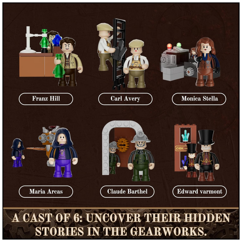 Minifiguras e criatura temática: Seis minifiguras e uma criatura mecânica em estilo steampunk (coruja mecânica)
