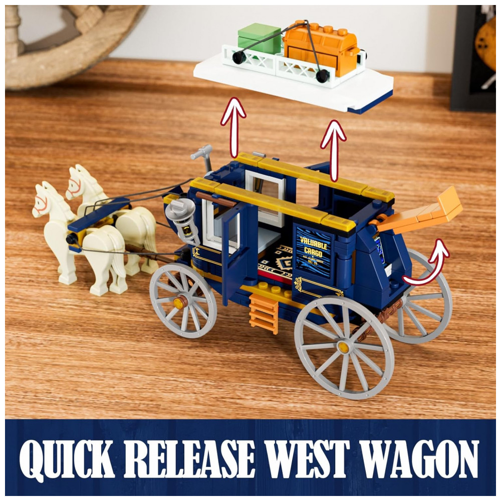 Conjunto de blocos de montar temático do Velho Oeste com 307 peças, composto por uma diligência reforçada para transporte de tesouros, cavalo e acessórios de carga, indicado para colecionadores e fãs de cenários western. A carruagem apresenta corpo detalhado com elementos impressos, portas e compartimento interno para guardar barras de ouro, moedas, joias, correntes e cédulas em miniatura.