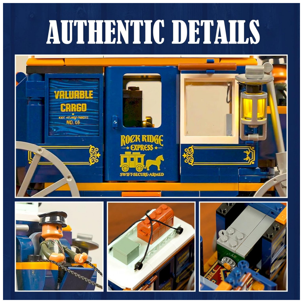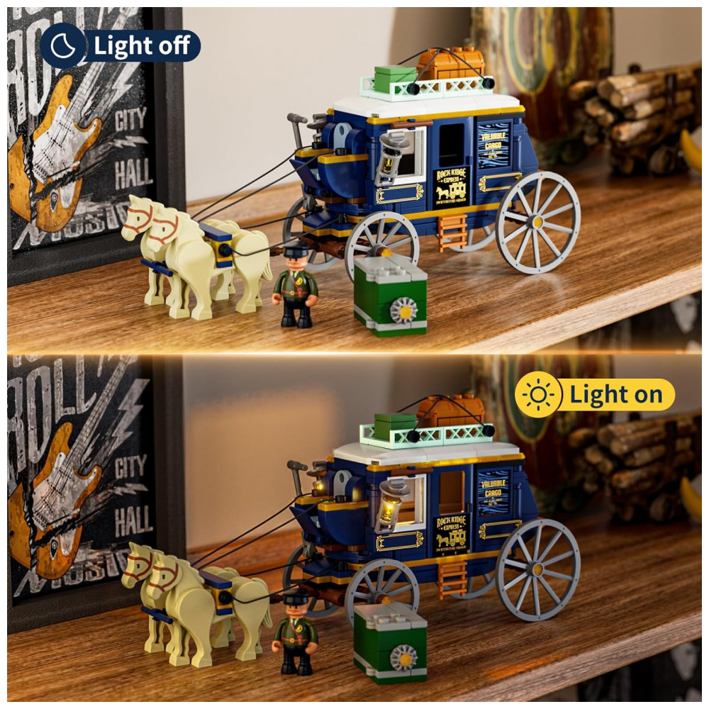 O modelo inclui baú de tesouro com sistema de fechamento e corrente de segurança, simulando transporte de valores para bancos, minas e autoridades. O kit conta com módulo de iluminação integrado, com pontos de luz distribuídos na carruagem para criar efeito de missão noturna e destacar o visual do conjunto em exposição.
