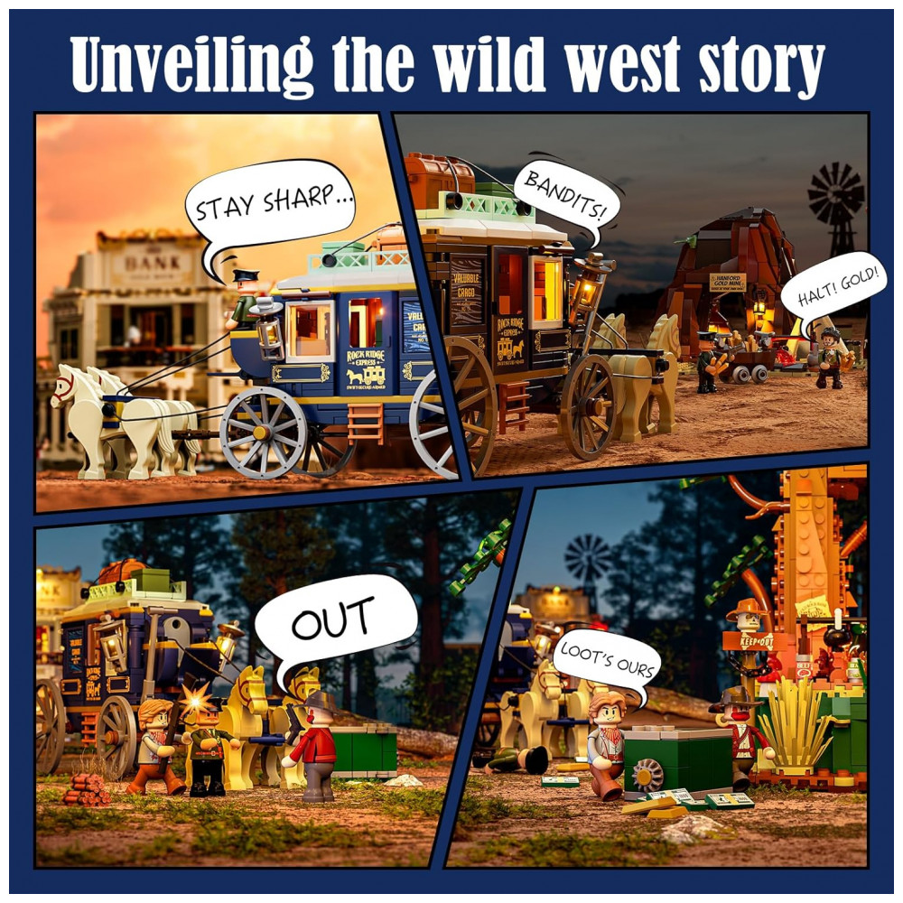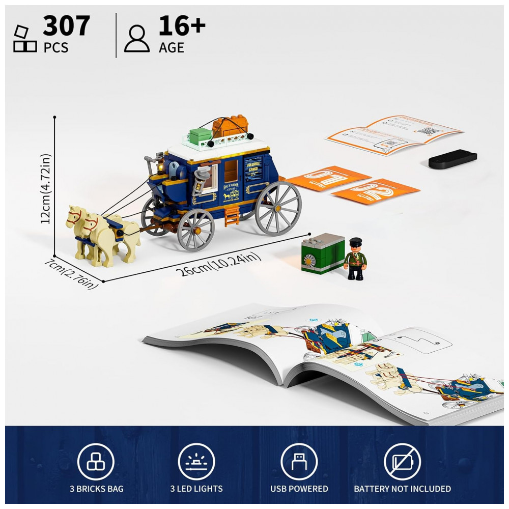 Conjunto de blocos de montar Lumibricks Western Treasure Stagecoach com iluminação LED carruagem Velho Oeste 307 peças