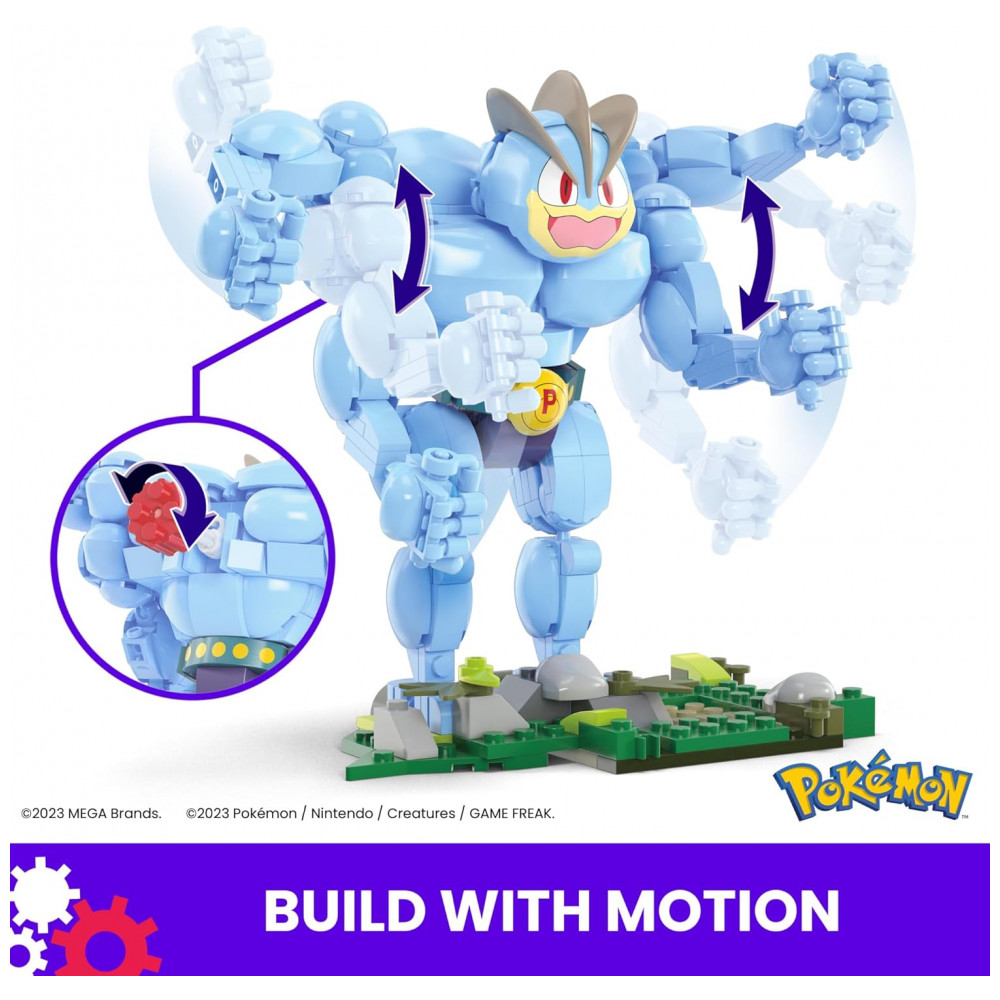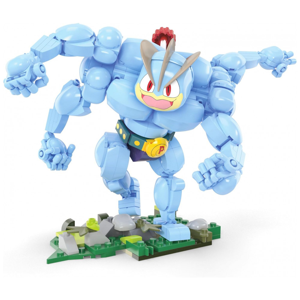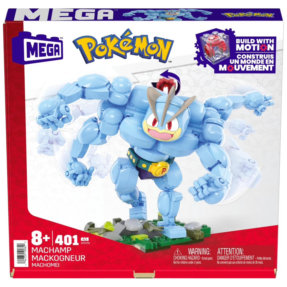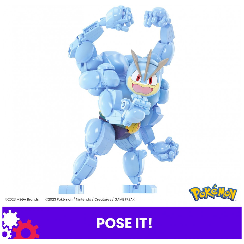 O conjunto de blocos de montar MEGA Pokémon Machamp é um kit de construção com 401 peças que permite montar uma figura articulada do Pokémon Machamp com sistema de movimento integrado. Após montado, o personagem atinge cerca de 18 cm de altura, apresentando corpo segmentado com quatro braços e base de sustentação estável para exposição em superfície plana.