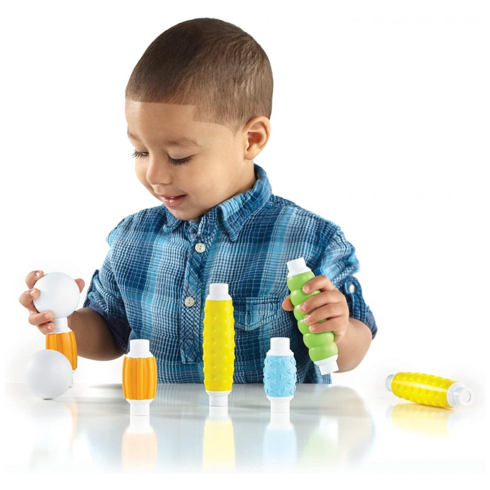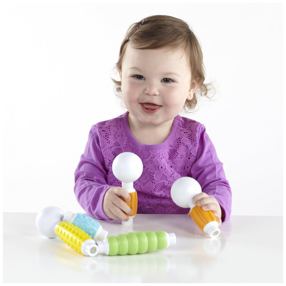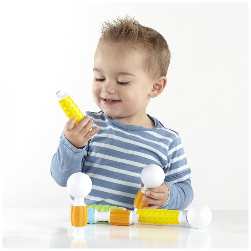 O kit traz 20 peças em cores suaves e brilhantes, com quatro texturas foscas diferentes que estimulam exploração tátil, preensão e coordenação motora fina, ao mesmo tempo em que introduzem princípios básicos de geometria e engenharia por meio de construções simples em 2D e 3D. A configuração de bastão e esfera oferece opções de montagem intuitivas, reduzindo frustração e apoiando noções de equilíbrio, simetria e causa e efeito em contextos livres ou mediadas por adultos.