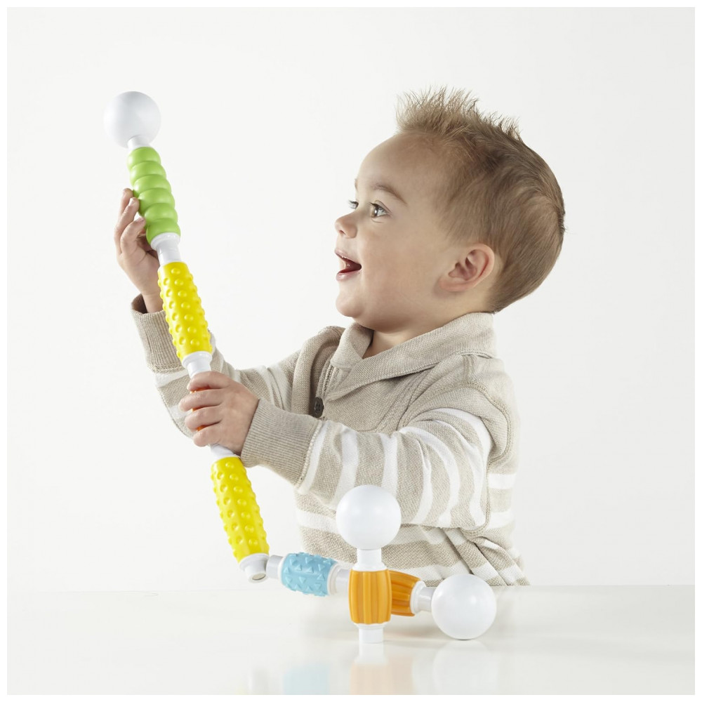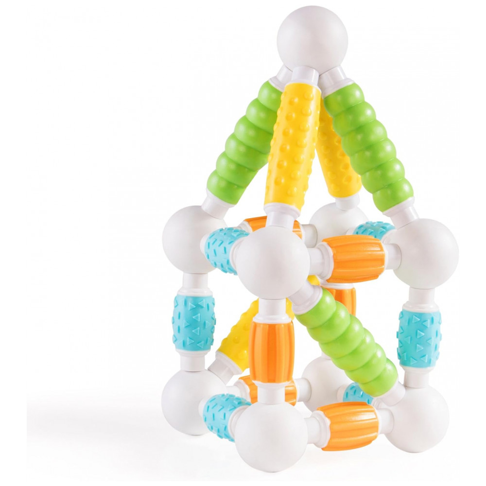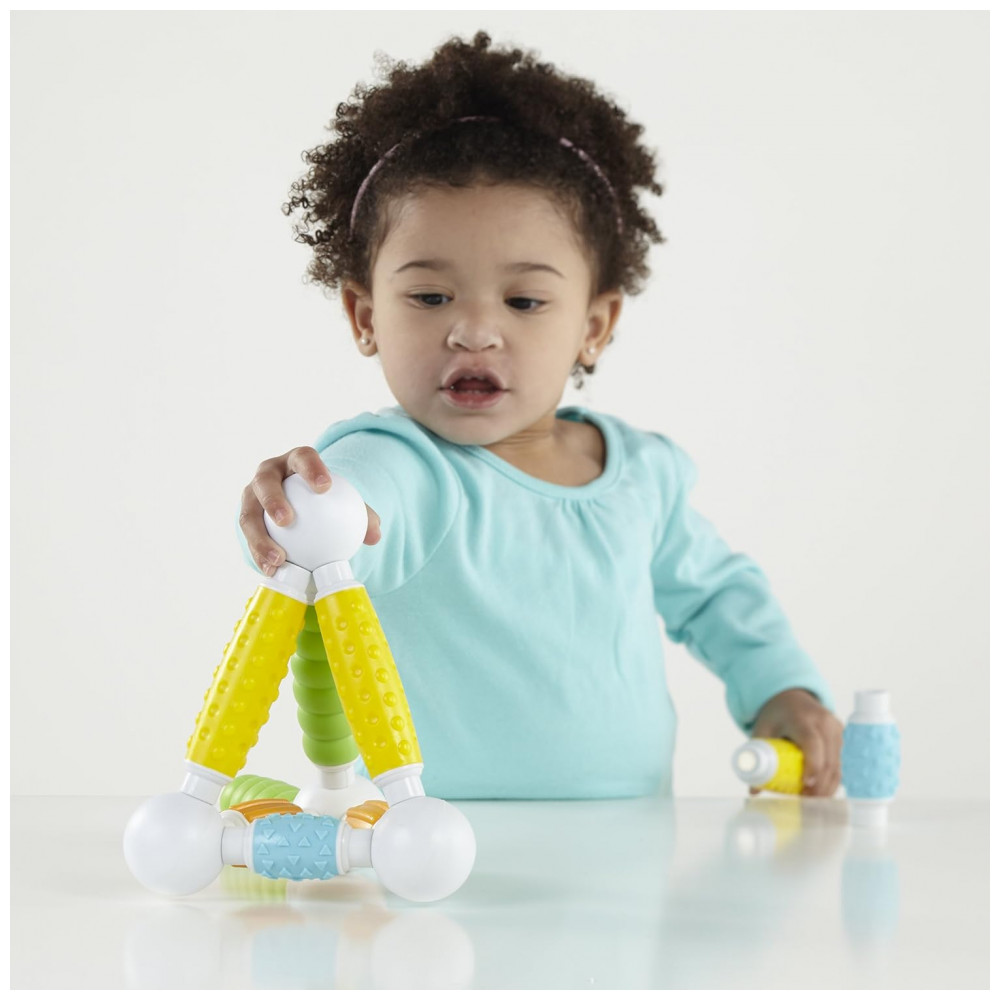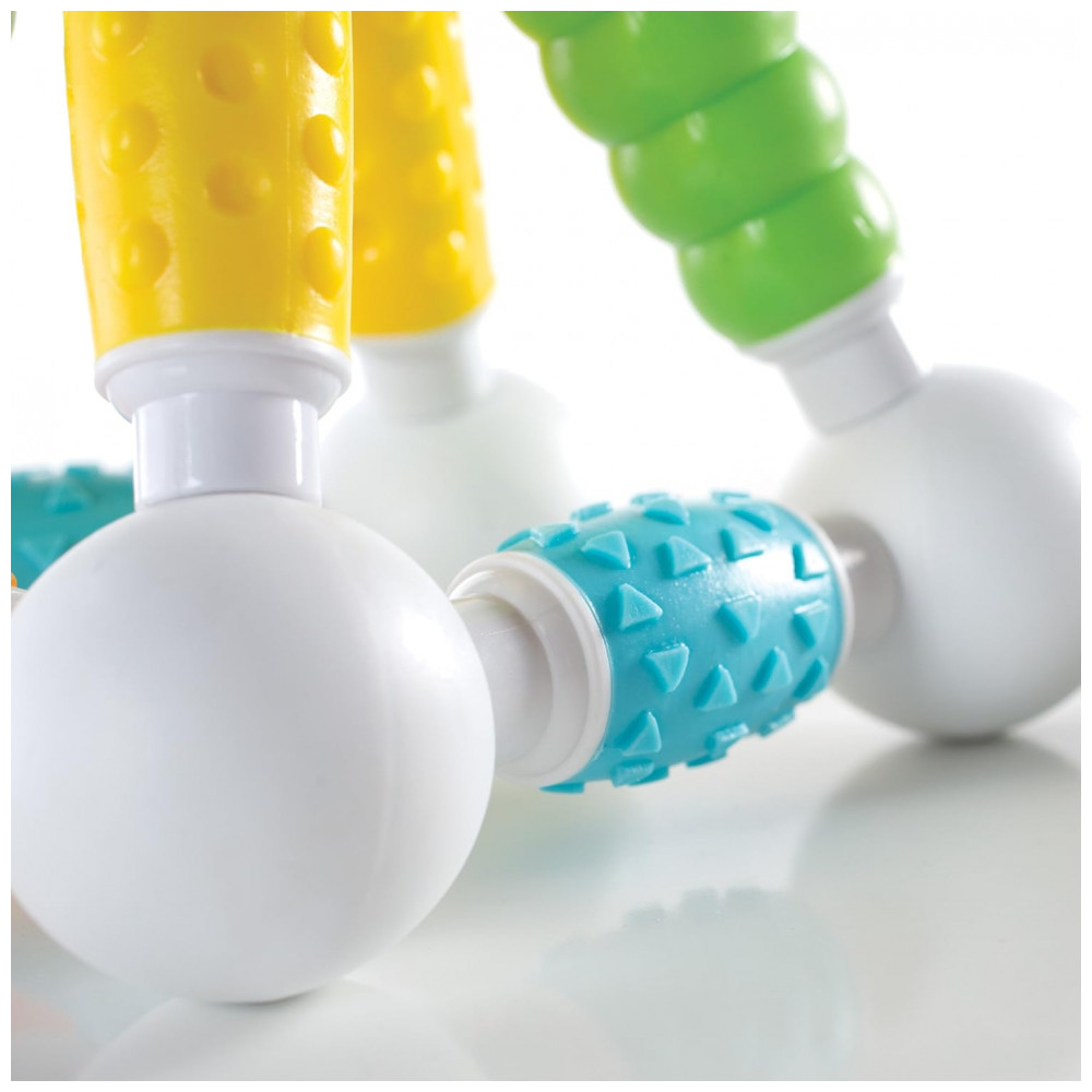 O kit inclui 30 peças em cores vivas, com quatro tipos de textura fosca macia que favorecem exploração tátil, preensão e coordenação motora fina, ao mesmo tempo em que introduzem princípios básicos de engenharia e geometria por meio de construções simples em 2D e 3D. A configuração de bastão e esfera facilita montagens intuitivas sem frustração, apoiando o desenvolvimento de noções de causa e efeito, equilíbrio e simetria em brincadeiras abertas.