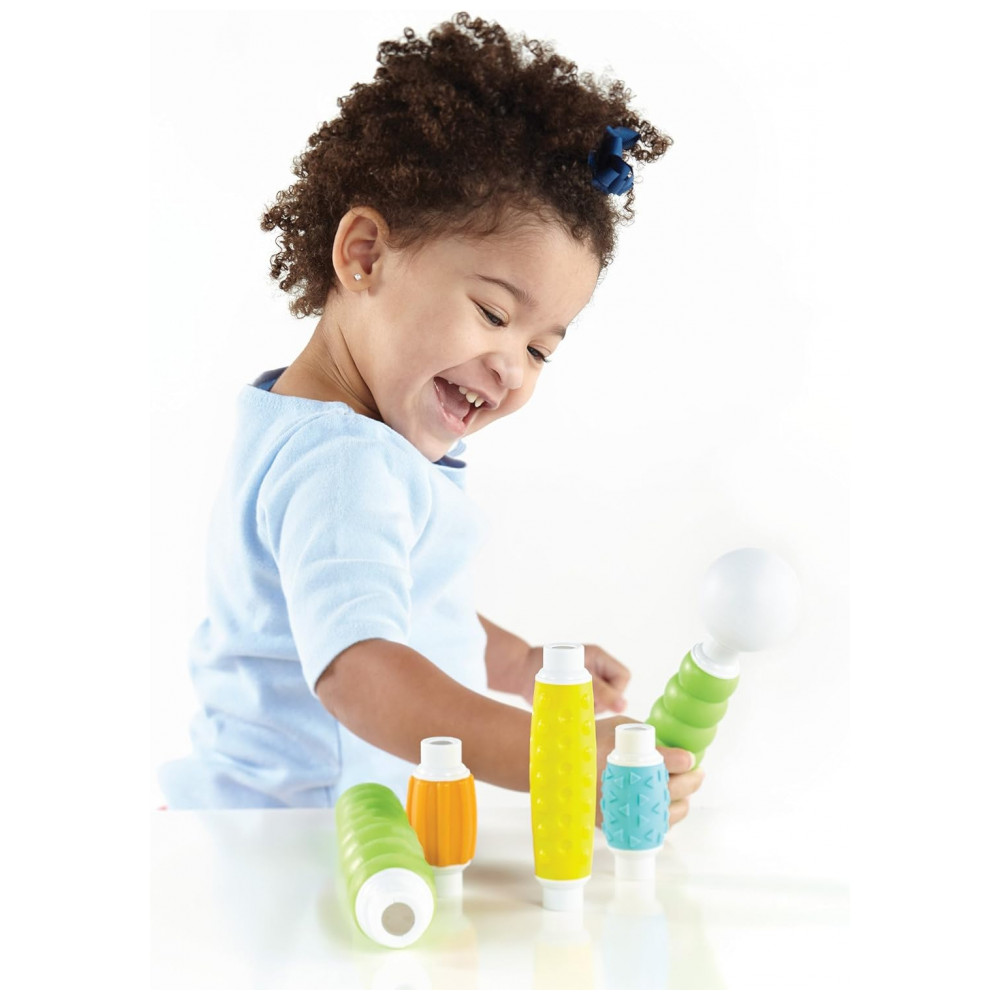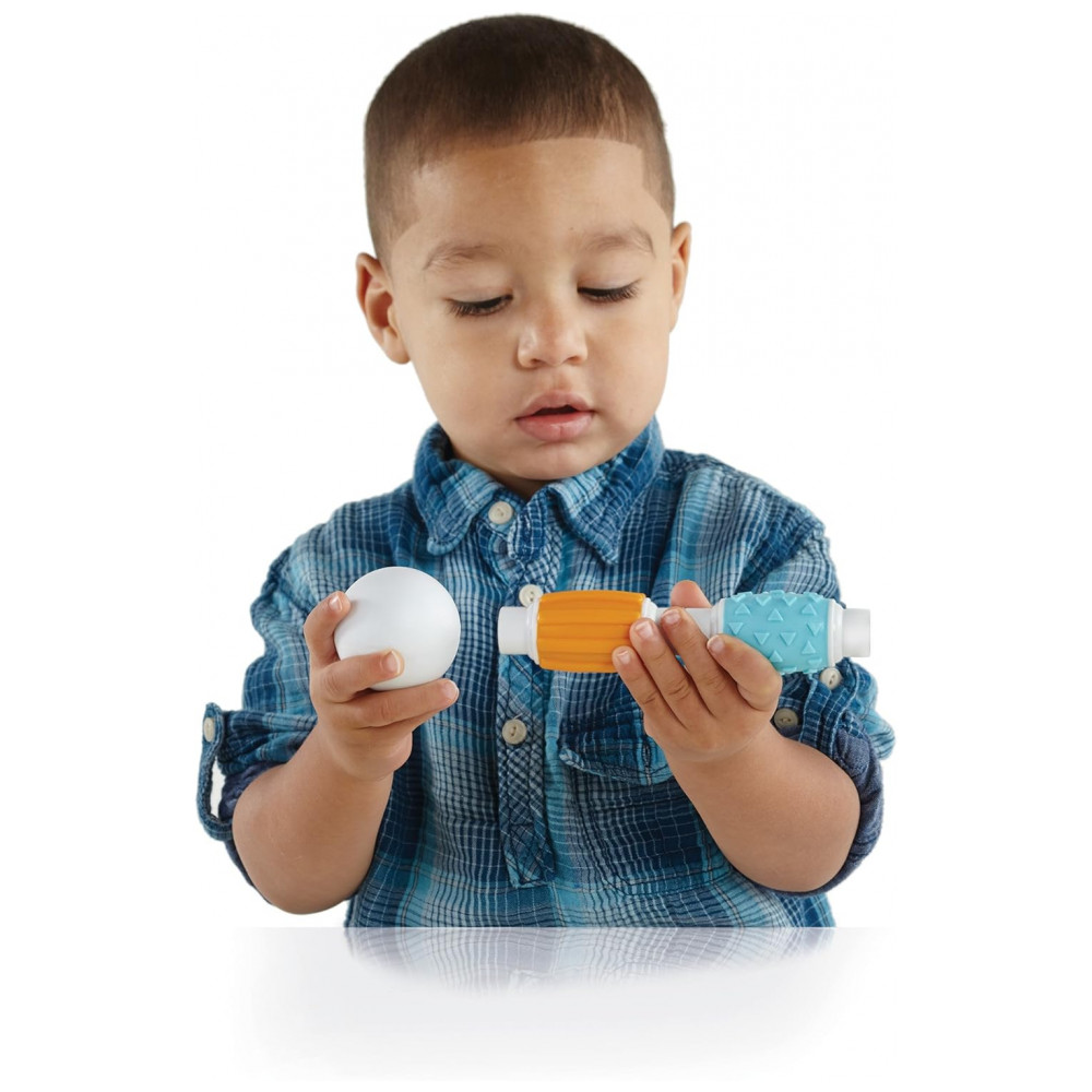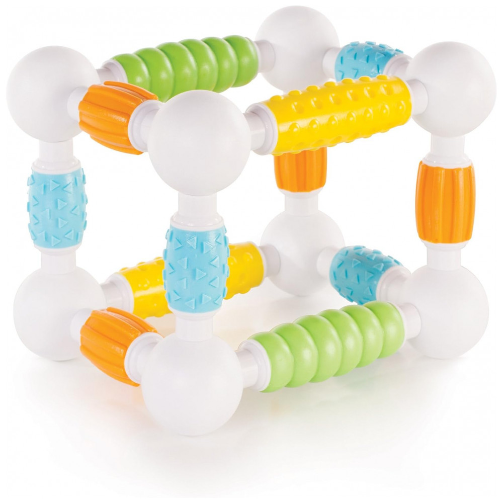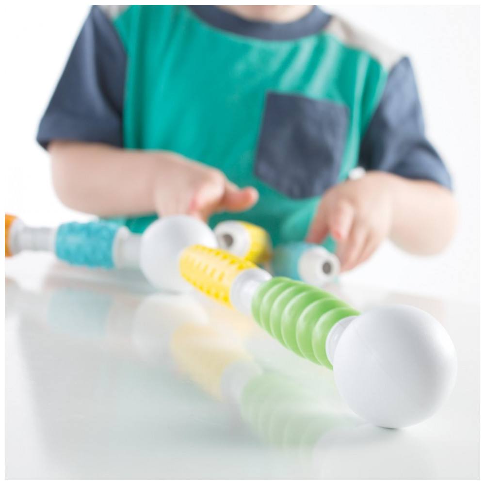 O kit inclui 30 peças em cores vivas, com quatro tipos de textura fosca macia que favorecem exploração tátil, preensão e coordenação motora fina, ao mesmo tempo em que introduzem princípios básicos de engenharia e geometria por meio de construções simples em 2D e 3D. A configuração de bastão e esfera facilita montagens intuitivas sem frustração, apoiando o desenvolvimento de noções de causa e efeito, equilíbrio e simetria em brincadeiras abertas.