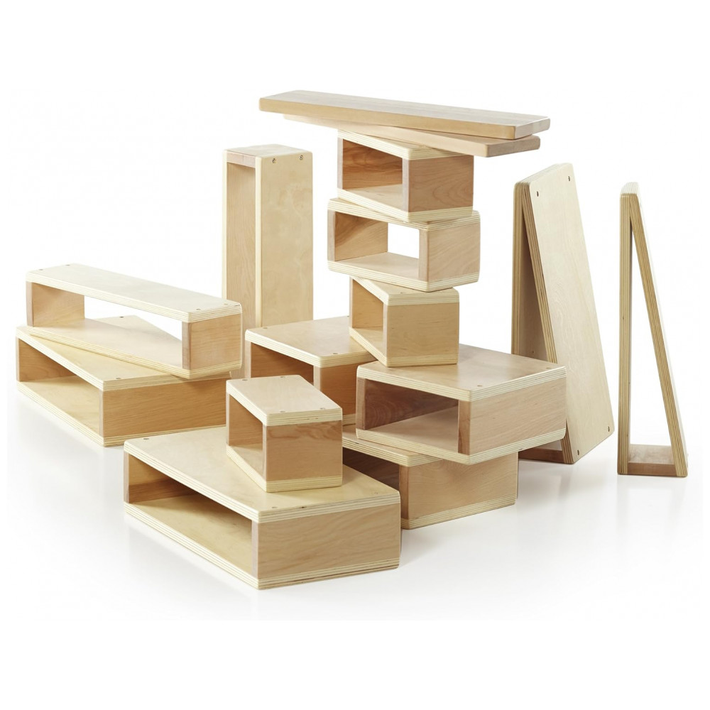 Conteúdo da caixa: 16 blocos ocos em madeira em diferentes formatos e tamanhos