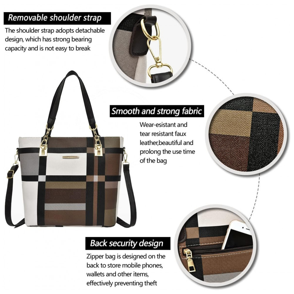 Material das bolsas 2E youth 6pcs para mulheres use couro sintético liso como material externo. A costura é bem feita, corre suave e uniformemente, é confortável ao toque. O material interno da bolsa 2E jovem é poliéster. Com zíperes macios e duráveis.