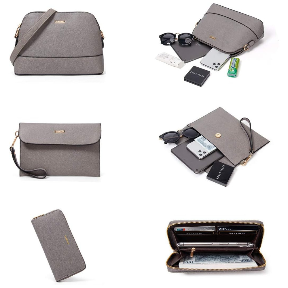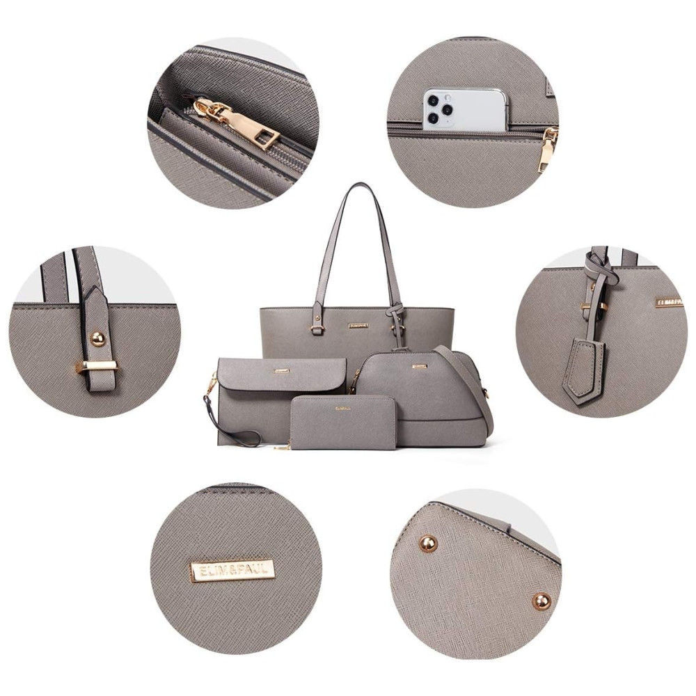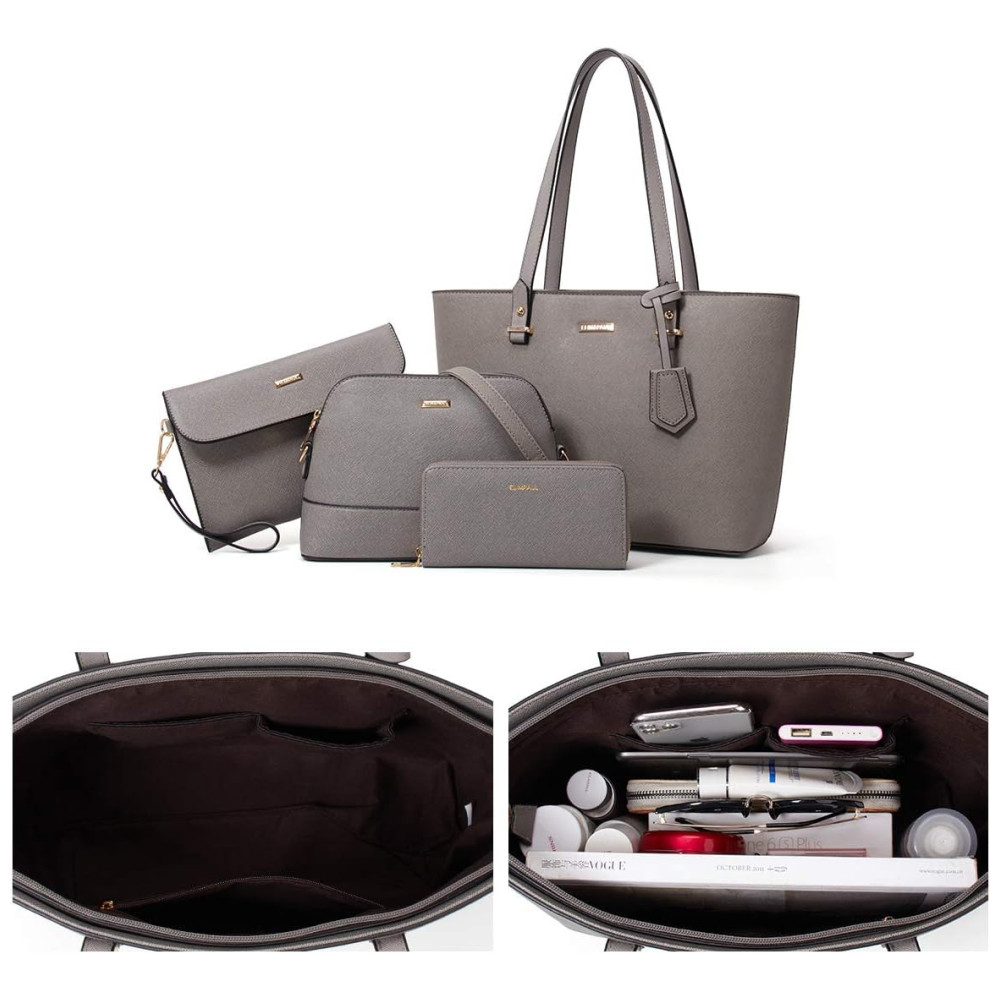Bolsos para sacola Um compartimento principal com zíper com um bolso interno com zíper, um bolso traseiro e dois bolsos para slot. 4 peças uma bolsa grande uma bolsa mensageiro uma embreagem de carteira um suporte para cartão. Perfeito para namoro, compras, trabalho, viagens, férias, festa e outras ocasiões e mantenha seus itens diários bem organizados.
