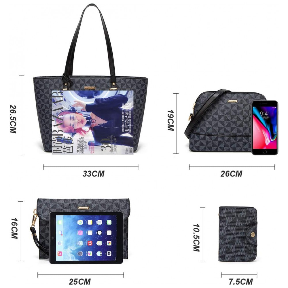 Tamanho Bolsa grande 33 x 26,5 x 12,69 centímetros, Bolsa transversal 26 x 9,49 x 19 centímetros, Carteira 20 x 10 x 3 centímetros, Porta cartão 10,5 x 7,5 x 1 centímetros. Peso total cerca de 1,05 kg. Por favor, você pode consultar o tamanho antes de comprá lo. Obrigado.