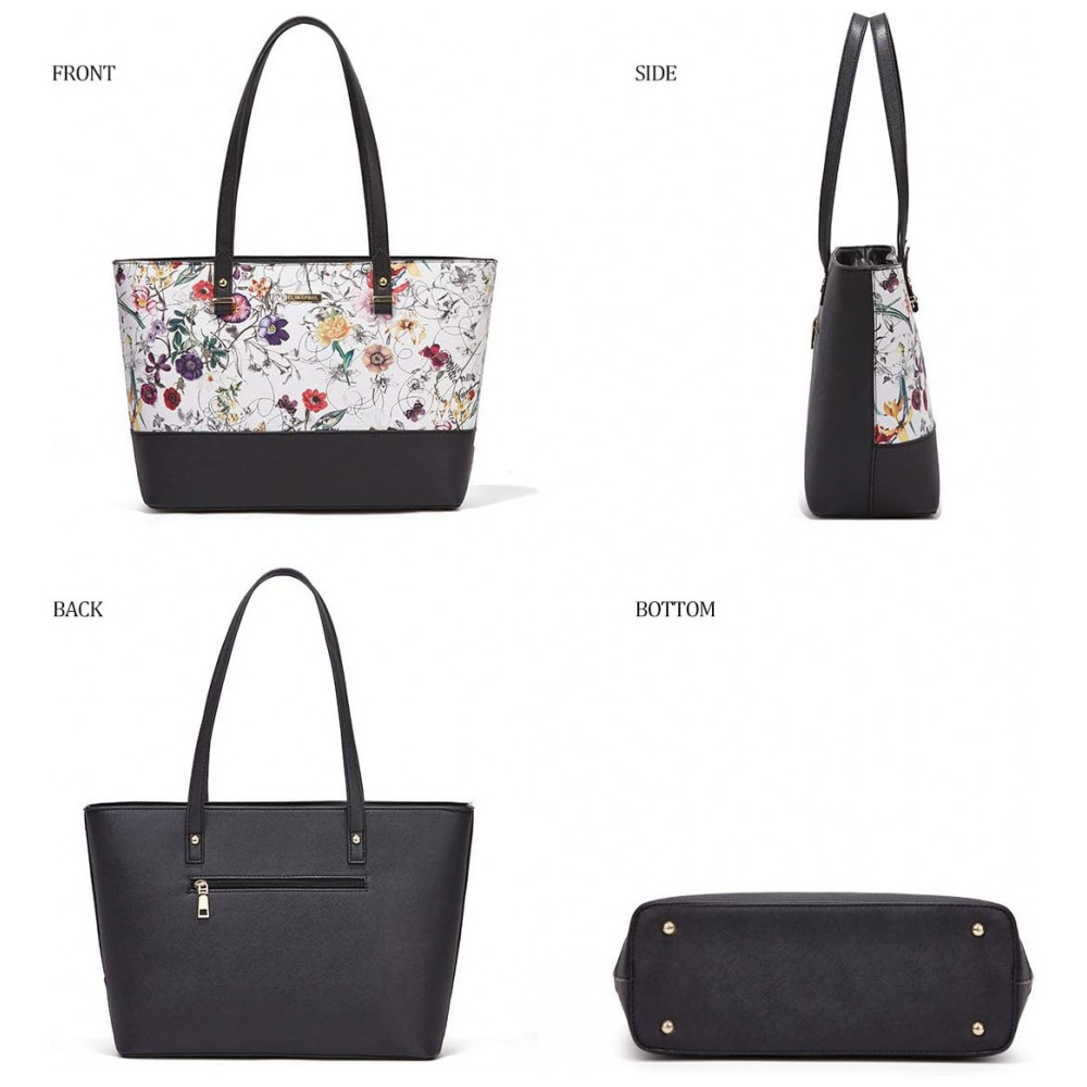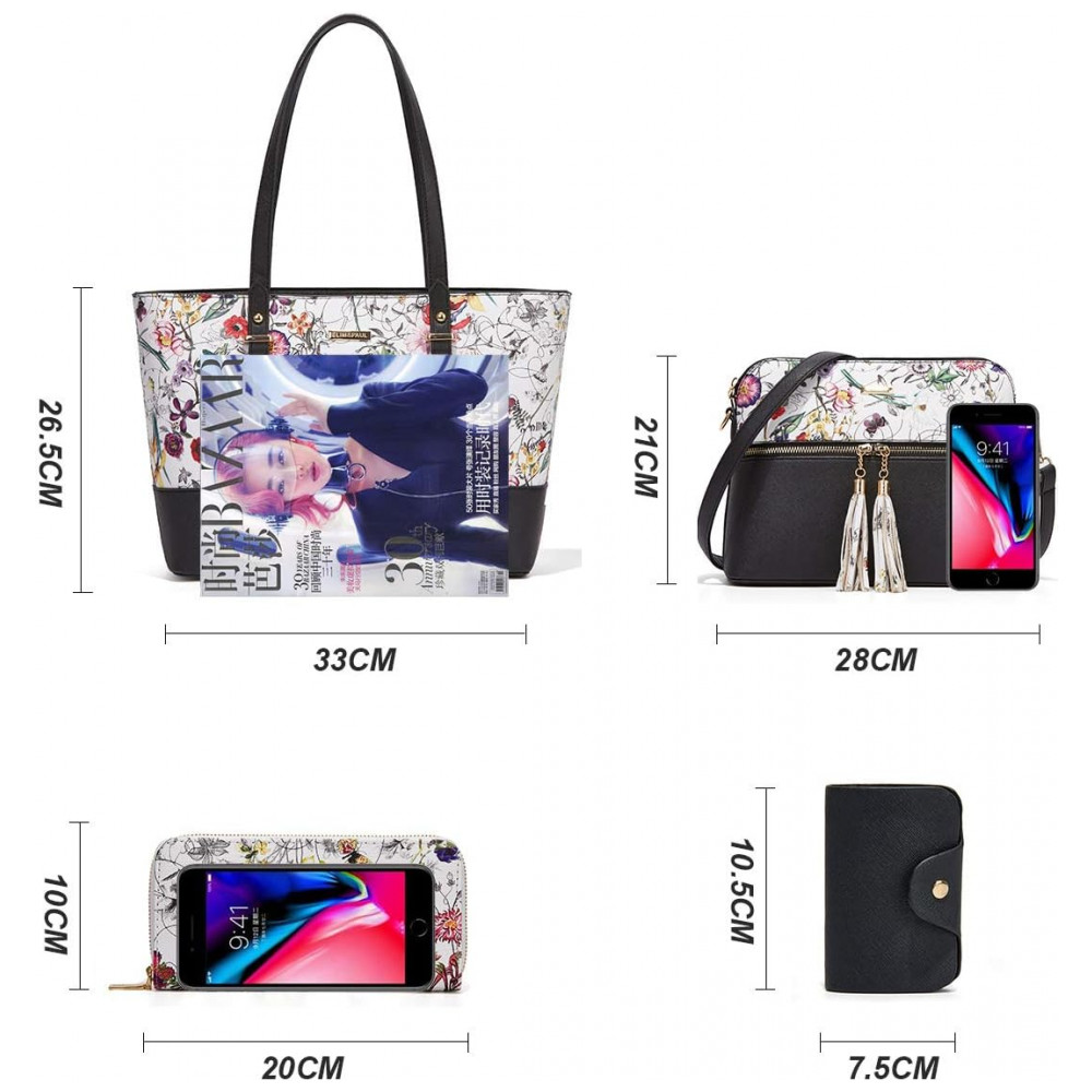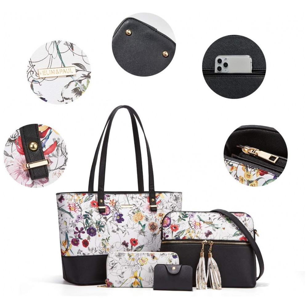 Conjunto de Bolsas Femininas em Couro Sintético 4 Peças com Carteira Lovematch Preto e Branco Florido