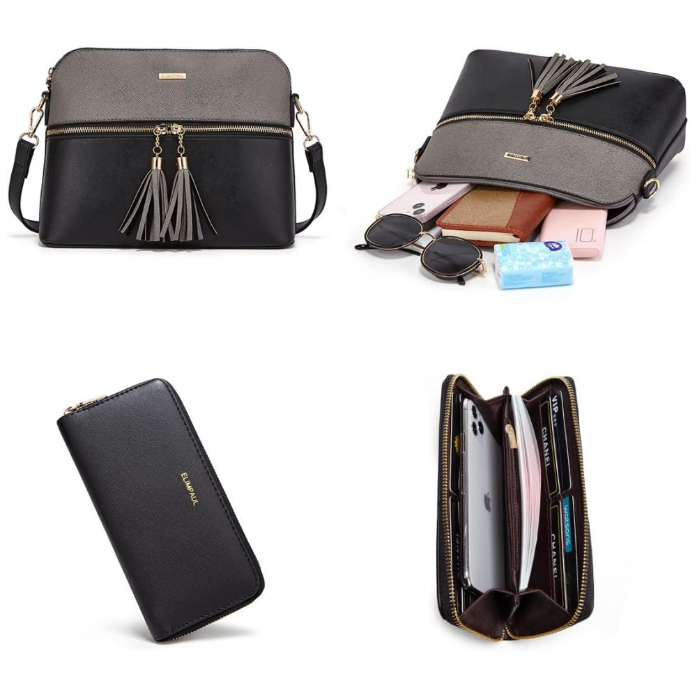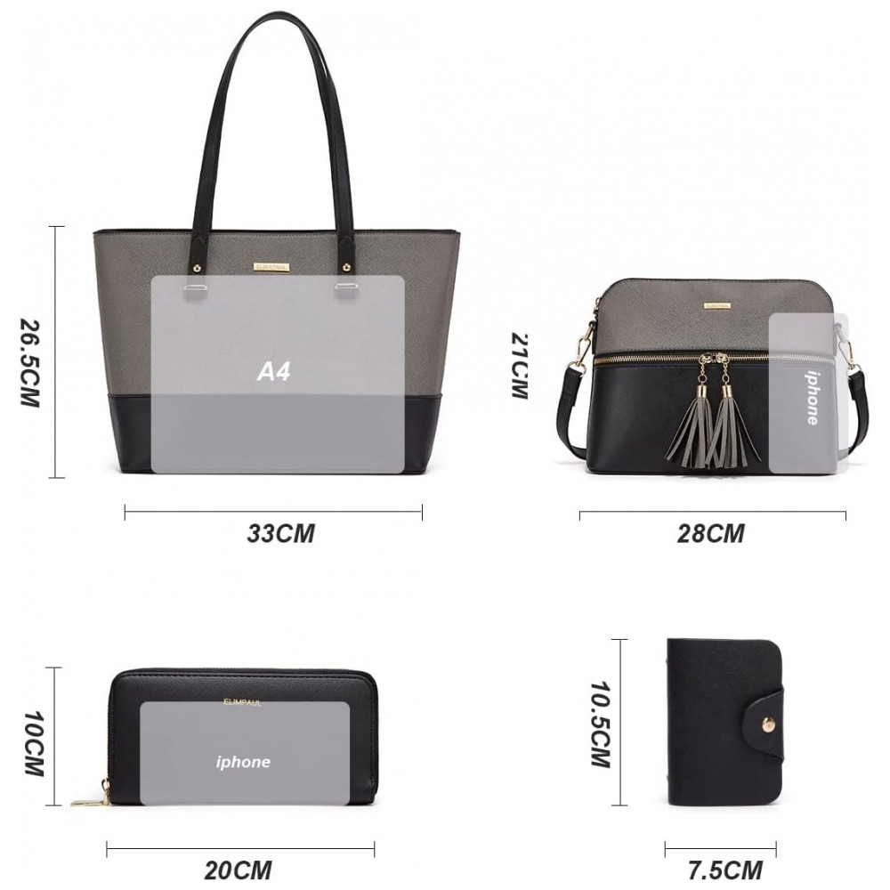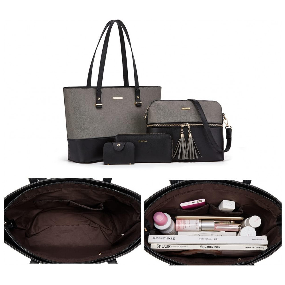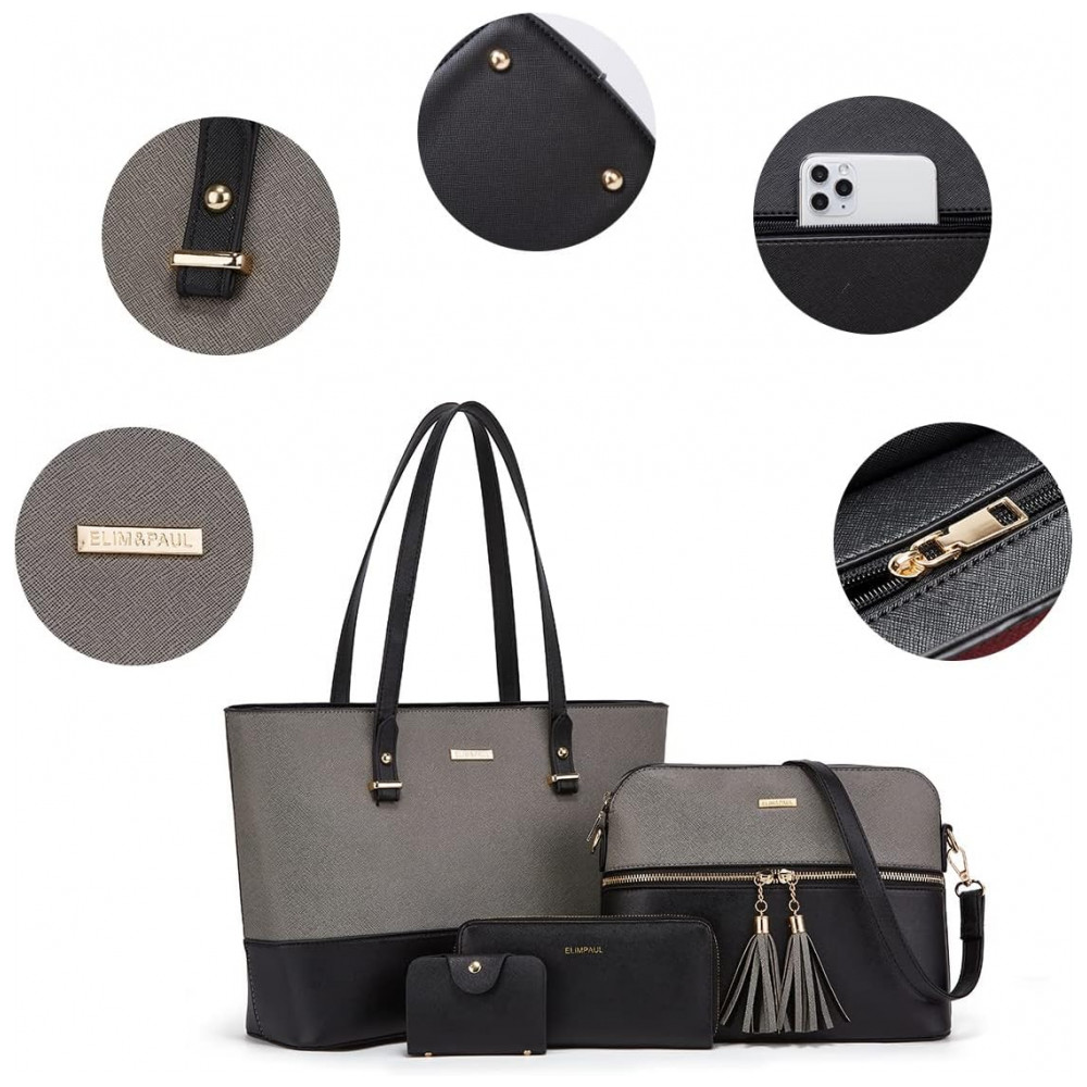 Conjunto de Bolsas Femininas em Couro Sintético 4 Peças com Carteira Lovematch Preto e Cinza Escuro