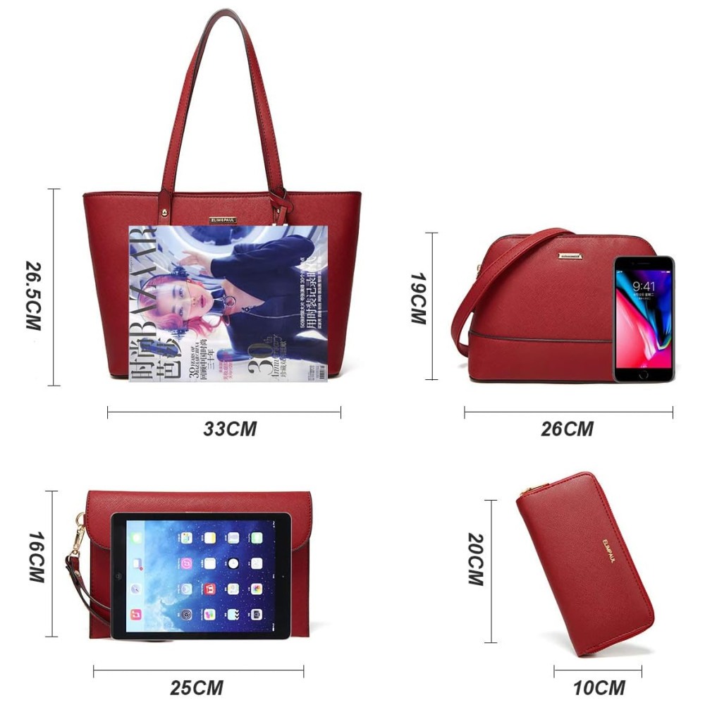 Tamanho Bolsa grande 33 x 26,5 x 12,69 centímetros, Bolsa transversal 26 x 9,49 x 19 centímetros, Carteira 20 x 10 x 3 centímetros, Porta cartão 10,5 x 7,5 x 1 centímetros. Peso total cerca de 1,05 kg. Por favor, você pode consultar o tamanho antes de comprá lo. Obrigado.