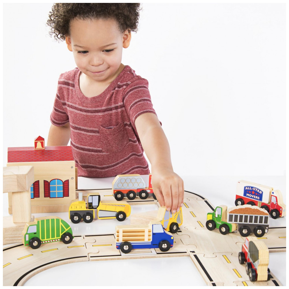Conjunto infantil de veículos em madeira com 12 caminhões, desenvolvido para brincadeiras de faz de conta, exploração de cenários urbanos e atividades de coordenação motora fina. A seleção inclui modelos como caminhão betoneira, retroescavadeira, caminhão de coleta, caminhão de mudanças e outros tipos de veículos de serviço, pensados para introduzir diferentes funções do transporte no dia a dia.