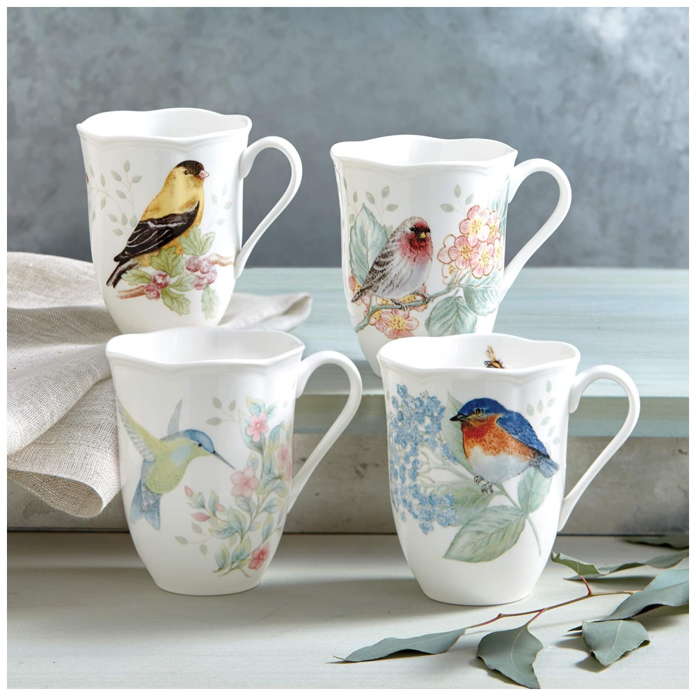 Butterfly Meadow Flutter é uma linda coleção de louças que apresenta belos pássaros, flores e borboletas em 4 novos padrões encantadores. Fabricado pela Lenox, uma marca líder em utensílios de mesa, este conjunto de canecas de porcelana recortada combina elegância e funcionalidade, tornando-o ideal tanto para o dia a dia quanto para ocasiões especiais.