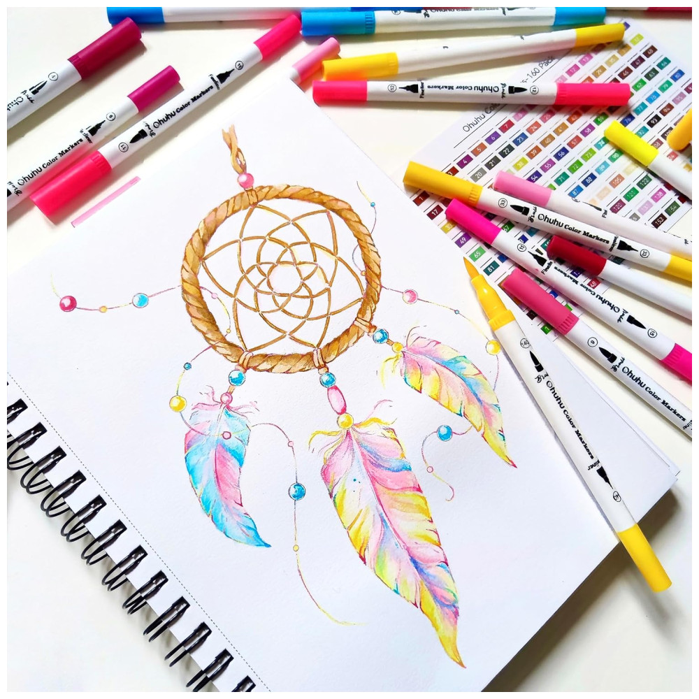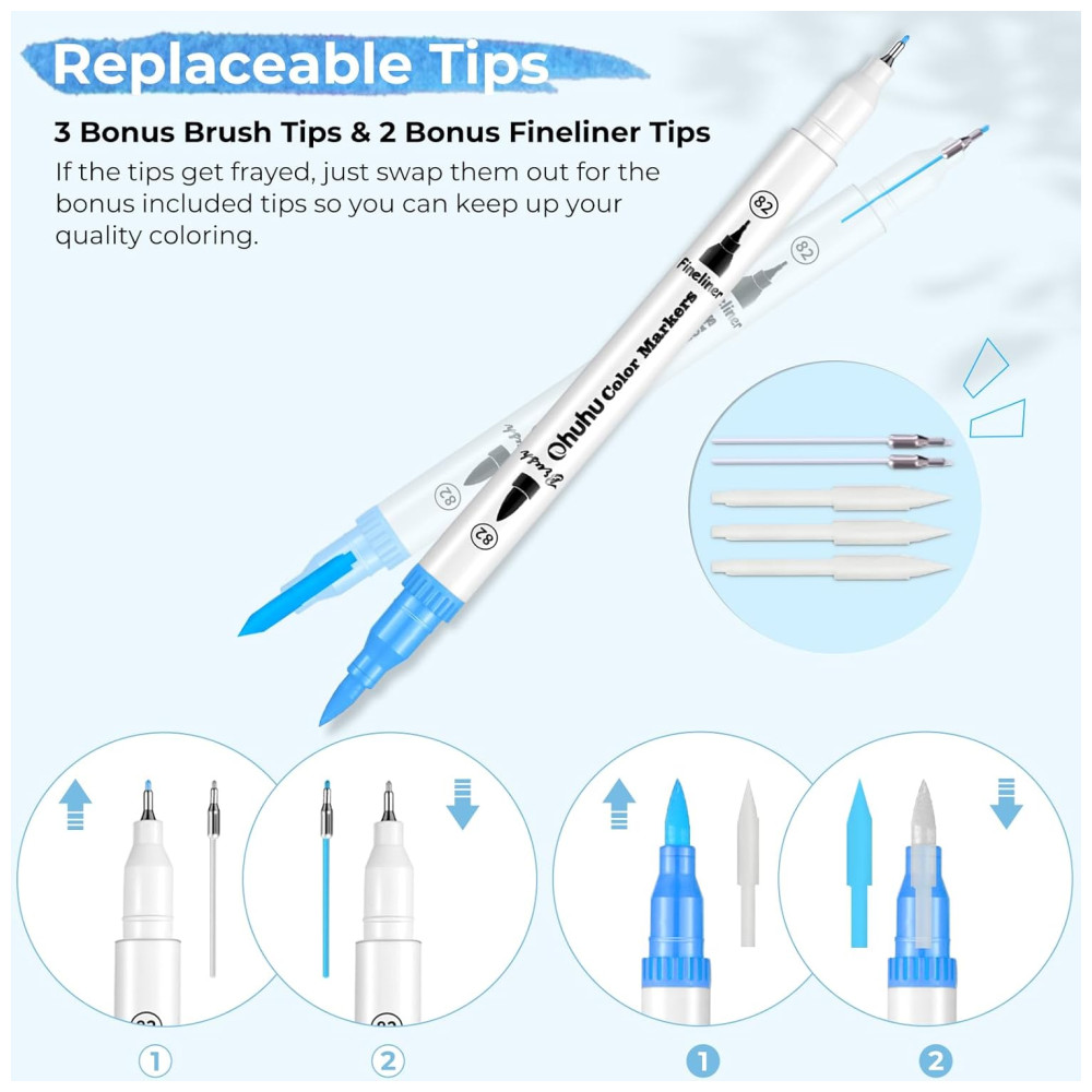 ESCOVA E FINO, DICAS DUPLAS, CRIATIVIDADE DUPLA: Os marcadores Ohuhu para livros de colorir para adultos são essenciais para sua próxima obra prima. A ponta fina de 0, pode deslizar através dos detalhes para colorir, escrever e rabiscar complexos com precisão fluida, enquanto a ponta macia do pincel de 1 flui através dos projetos de arte de grandes áreas para sombreamento, coloração, mistura e muito mais, perfeita para caligrafia e criação padrão interessante para projetar seu diário.