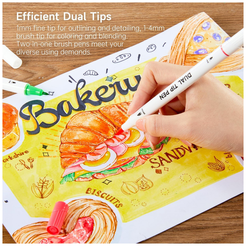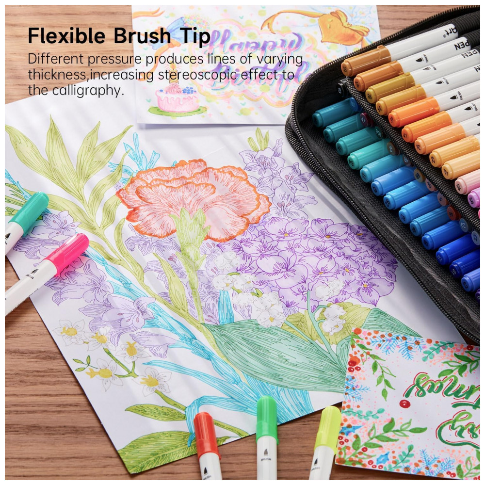 PENSAS DE PONTA DUPLA: ponta de pincel de fibra flexível de 1 e ponta fina de em um marcador, permite criar traços médios ou os alterando a pressão do pincel e experimentar traços finos com ponta fina. Nossas pontas são feitas de material de fibra especial que é resistente ao desgaste, sem ramificações e durável por muito tempo. E o design de 105 tampas coloridas combinadas facilita o reconhecimento de cada cor.