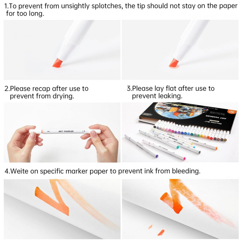CUIDADOS: O conjunto de marcadores não é tóxico e não contém ácido, é para crianças e estudantes, em conformidade com ASTM D4236. Para evitar o sangramento da tinta durante o uso, a ponta não deve permanecer muito tempo no papel. Os marcadores precisam ser escritos em um papel de marca específico para que não vazem para a próxima camada. Para evitar que o marcador seque e vaze tinta, recapitule e mantenha o marcador na horizontal após o uso