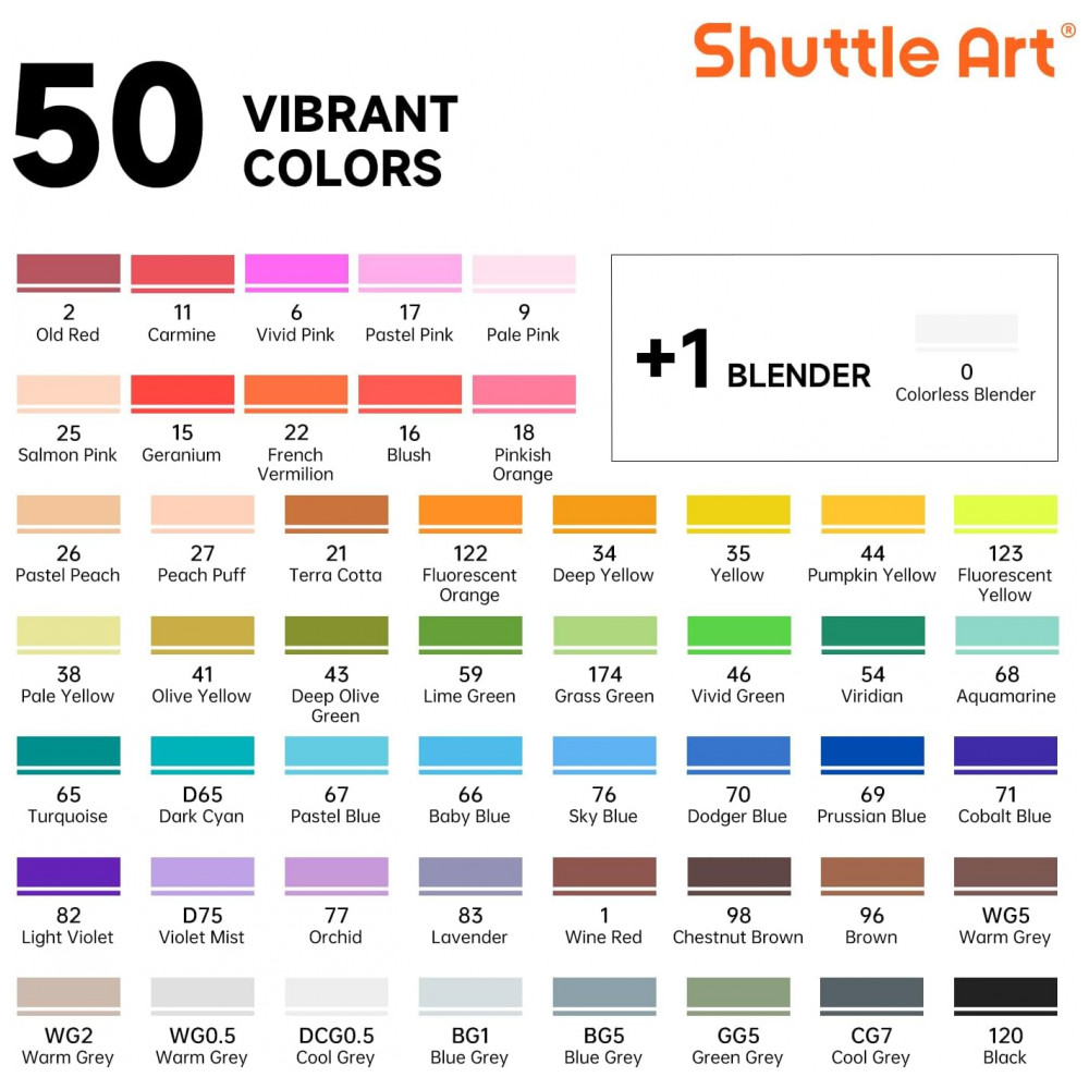 51 CORES: 50 marcadores permanentes vibrantes resistem ao desbotamento com o tempo, bônus 1 liquidificador incolor. Os marcadores permanentes à base de álcool de ponta dupla Shuttle Art são classificados para 300 metros de uso contínuo, o que fornece uma grande quantidade de tinta por marcador.