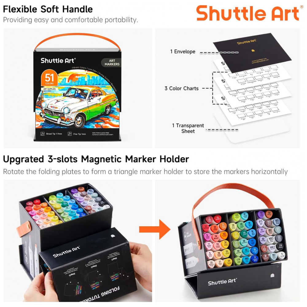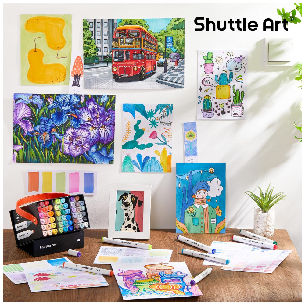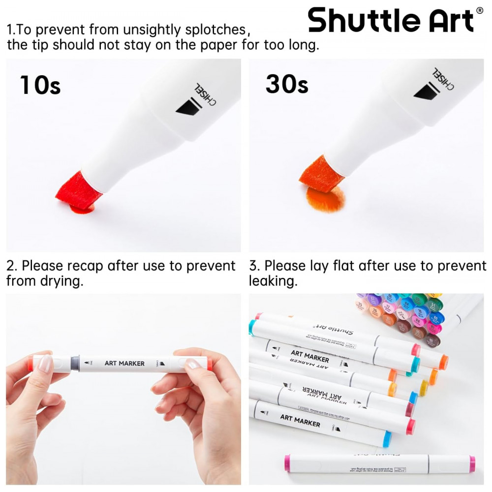 TINTA FÁCIL DE MISTURAR: Os marcadores de ponta dupla Shuttle Art se misturam e se sobrepõem bem sem deixar marcas e secam rapidamente. Misturar cores é muito fácil, colocando uma cor única sobre outra, criando uma paleta de cores ilimitada. Os marcadores precisam ser escritos em um papel de marca específico para que não vazem para a próxima camada. Para evitar que o marcador seque, recapitule e mantenha o marcador deitado após o uso. O conjunto de marcadores não é tóxico e não contém ácido, é para crianças e estudantes, em conformidade com ASTM D4236