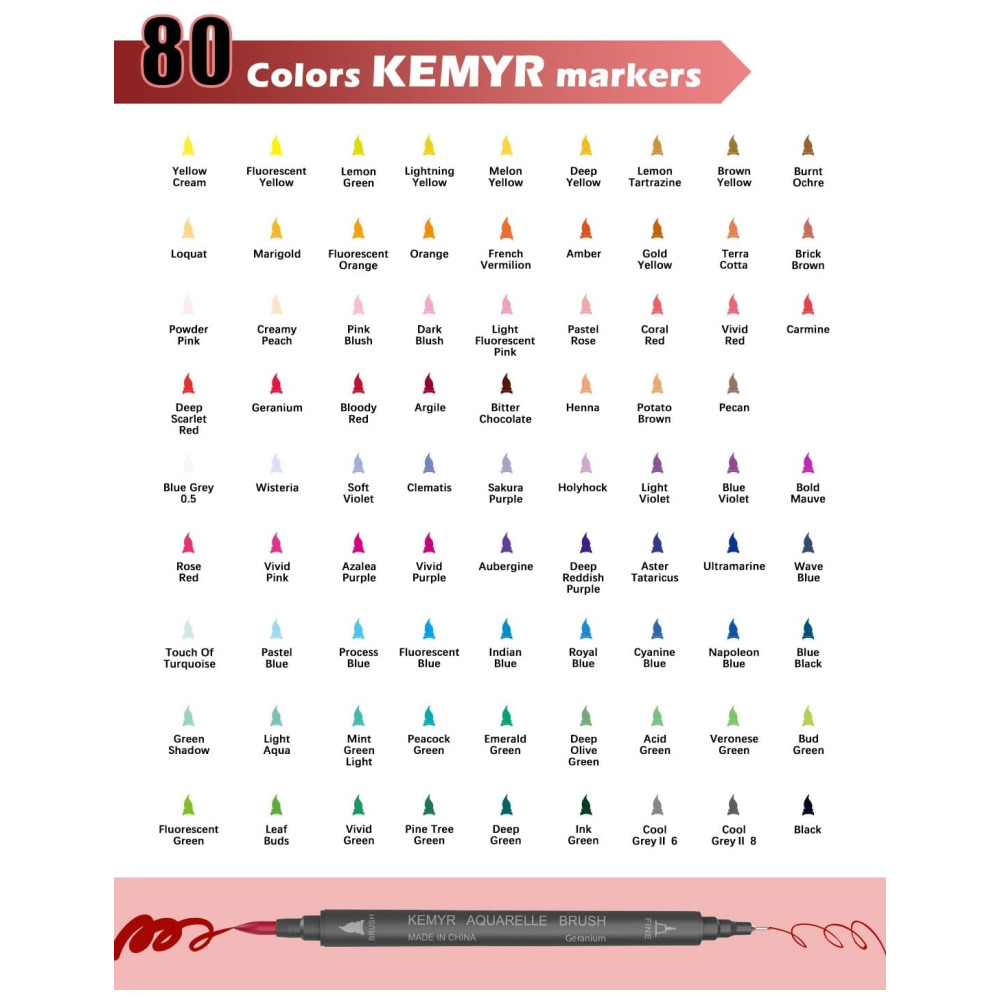 80 CORES ÚNICAS 80 cores diferentes de marcadores para colorir atendem totalmente às necessidades de pintura dos iniciantes. Tanto a ponta fina quanto a ponta do pincel possuem 80 cores vivas. Portanto, você só precisa de um conjunto de marcadores de ponta dupla para escrever, pintar e colorir.