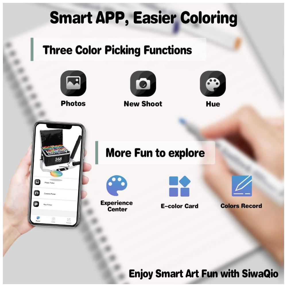 APLICATIVO DE CORES EXCLUSIVO, COLORAÇÃO MAIS FÁCIL O marcador SiwaQio de 80 cores recalibra o mapa de cores para combinar com as cores do APP. Três funções seletor de fotos, disparo, HUE ajudam a identificar o marcador de arte mais adequado para a arte e, em seguida, encontrar rapidamente os marcadores específicos pelas tampas codificadas por cores. Economizando tempo e ajudando você a sair do dilema de escolha de cores, traz diversão de desenho eficiente e inteligente. O APP é fácil de operar, mesmo para crianças. Não importa se adultos ou crianças vão adorar.