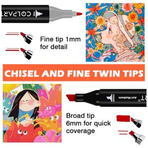 DIFERENTES PROJETOS DE CABEÇA DUPLA: A caneta marcadora tem duas cores de preto e branco, e o design do porta caneta quadrado dificulta o deslizamento durante o uso. O design de extremidade dupla de cinzel áspero e ponta fina é dotado de propriedades multifuncionais. A ponta fina pode ser usada para marcas de caligrafia detalhadas, a nota de cinzel largo é adequada para áreas de pintura de grandes áreas, dois designs correspondentes de NIB diferentes, coloração mista perfeita, pode melhorar a eficiência da coloração.