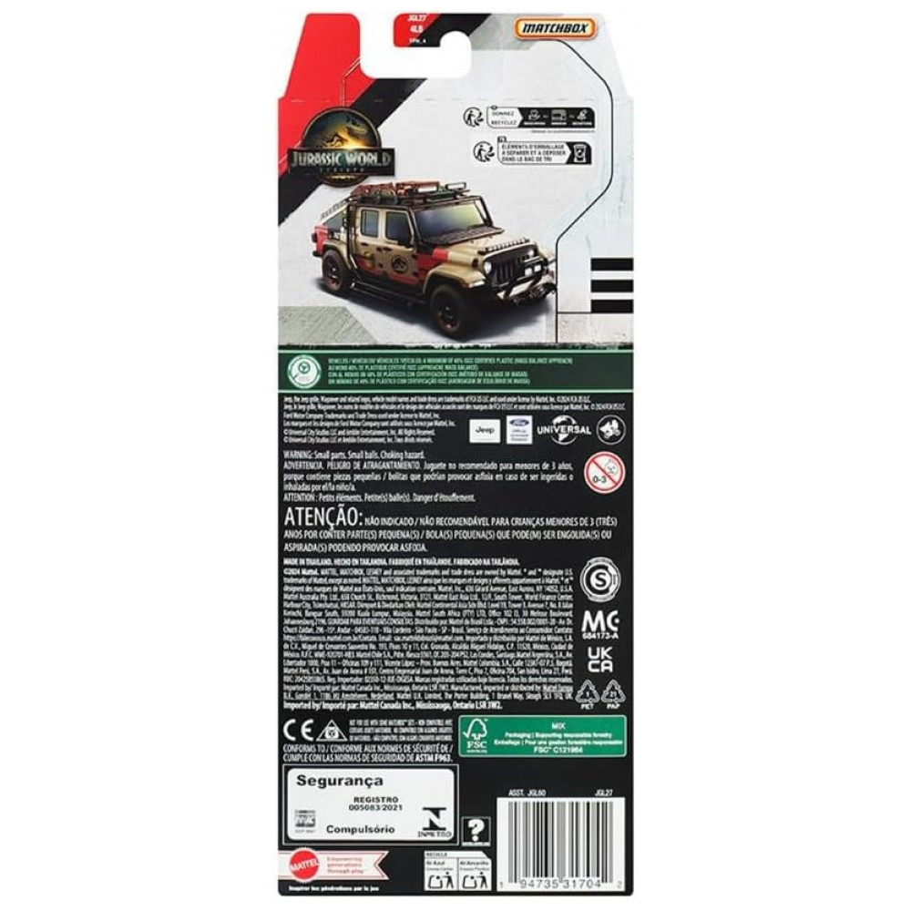 O Matchbox Jurassic World Rebirth Dinosaur Toy Cars 5-Pack (Set 4) é um conjunto com 4 veículos de metal em escala 1:64 e 1 mini dinossauro, inspirado nos filmes da franquia Jurassic World, incluindo a linha Rebirth. Os veículos apresentam carrocerias licenciadas ou originais Matchbox com decoração temática de parque, captura e transporte de dinossauros, pensados para brincadeiras de aventura e perseguição.